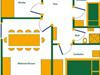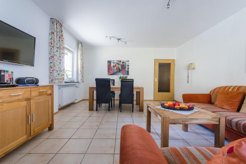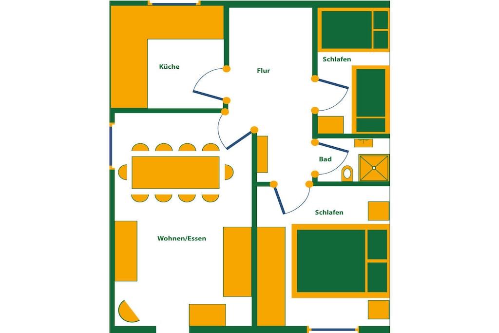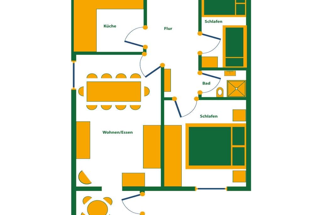 Stueetage: (Køkken(kogeplade, ovn, opvaskemaskine , køleskab), stue / spisestue(enkeltsovesofa, Fjernsyn, spisebord), soveværelse(enkeltseng, enkeltseng), soveværelse(dobbeltseng, dobbeltseng)) terrasse, havemøbler