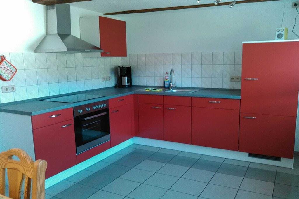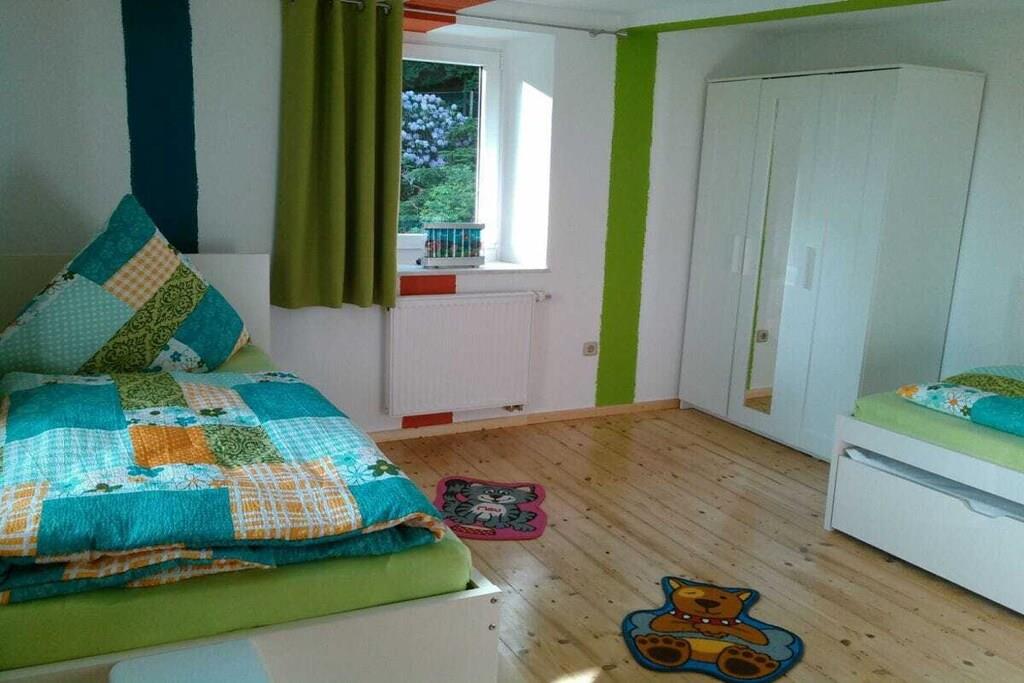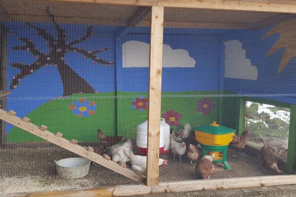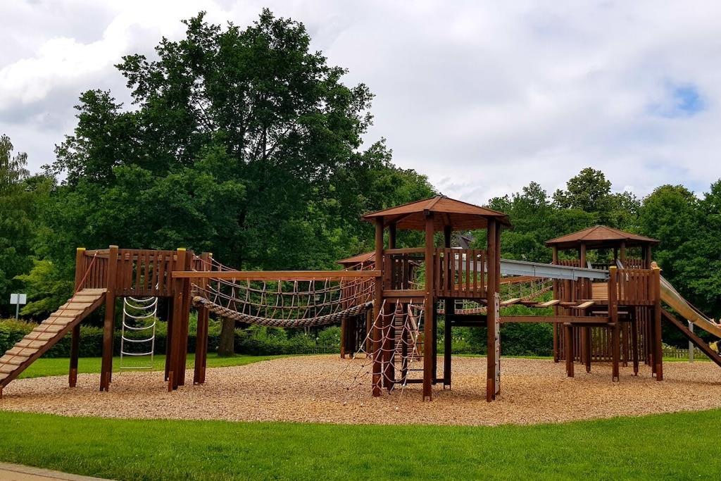 På 1. etage: (entre(), Stue(, , , Fjernsyn), Køkken(, , tekøkken, spisebord, radio, kogeplade, elkedel, brødrister, kaffemaskine, ovn, opvaskemaskine , køleskab, fryser), soveværelse(, , enkeltseng, enkeltseng, enkeltseng, enkeltseng), soveværelse(, , dobbeltseng, tremmeseng), badeværelse(, toilet, bruser, håndvask)) , , , Internetadgang, Førstehjælp, varme, terrasse(, havemøbler), have(Grill center, Græsplæne, pejs, grill, havemøbler, solstole, trampolin, sandkasse, rutsjebane, bordfodbold, Gyngestativ), parkering, tørreskab