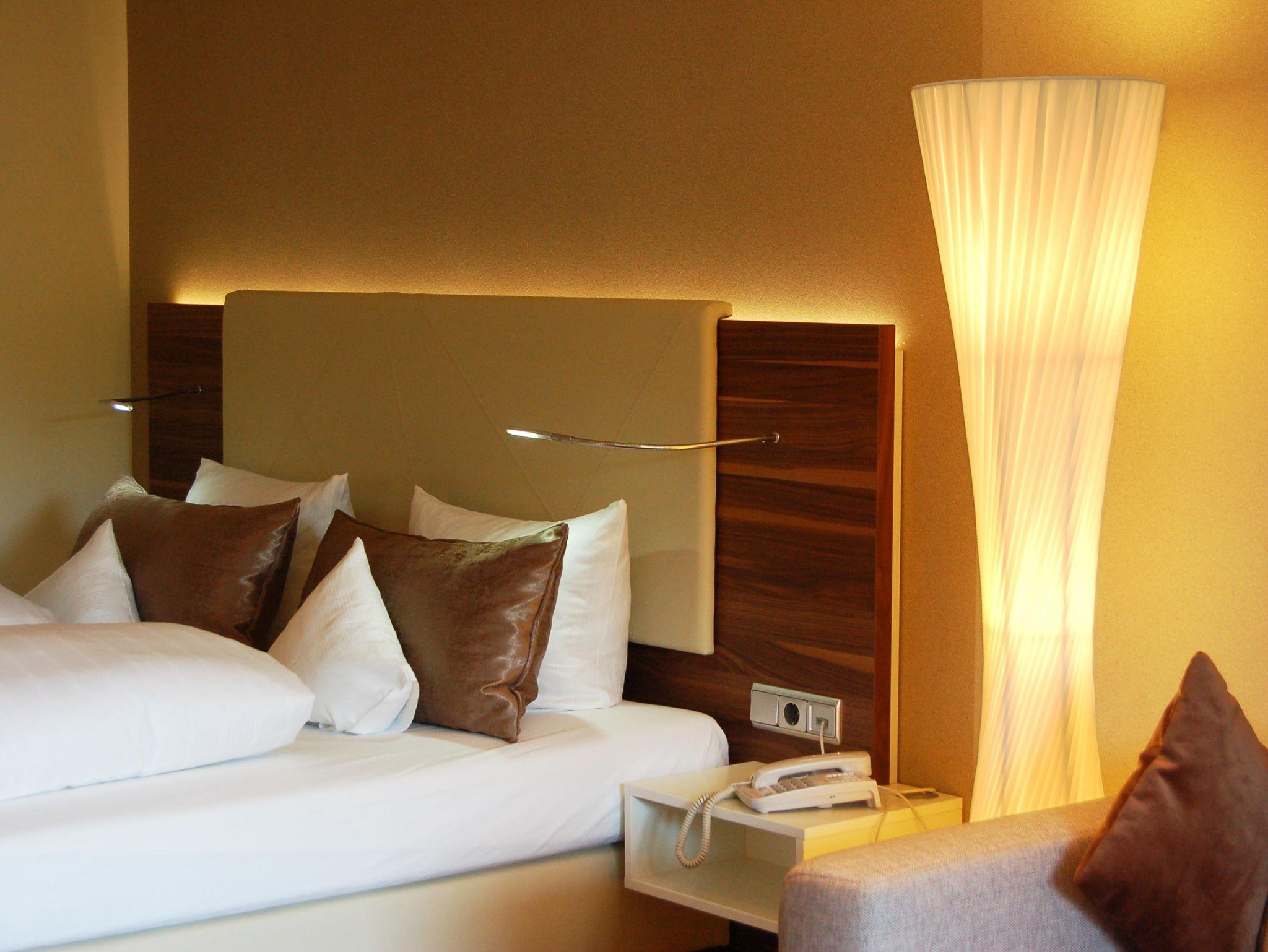 Sie übernachten in einem komfortablen modernen Deluxe Doppelzimmer mit Balkon (Bad / WC) und entspannen Sie im Hallenbad und in der Saunalandschaft.
