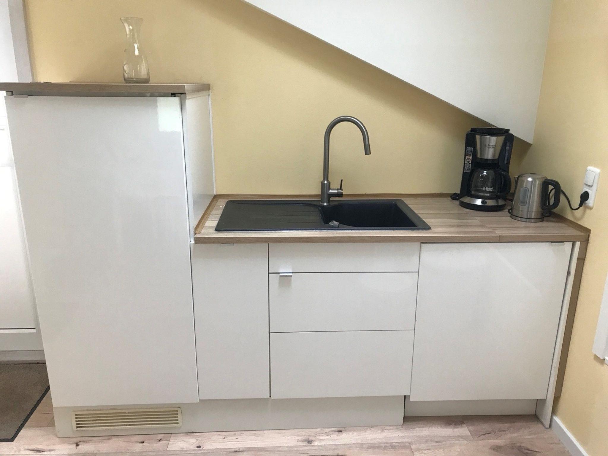 Die Küche ist mit Kühlschrank inkl. Gefrierfach, Herd, Backofen, Wasserkocher, und Küchenutensilien ausgestattet. Zum Reinigen Ihrer Kleidung stehen eine Waschmaschine und ein Trockner in der Wohnung zur Verfügung.