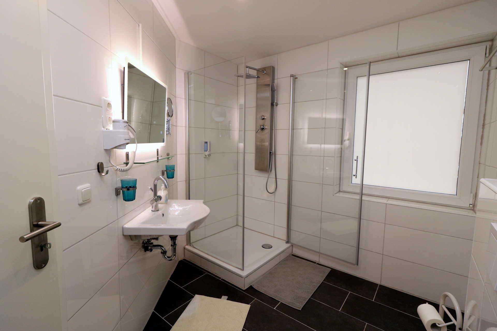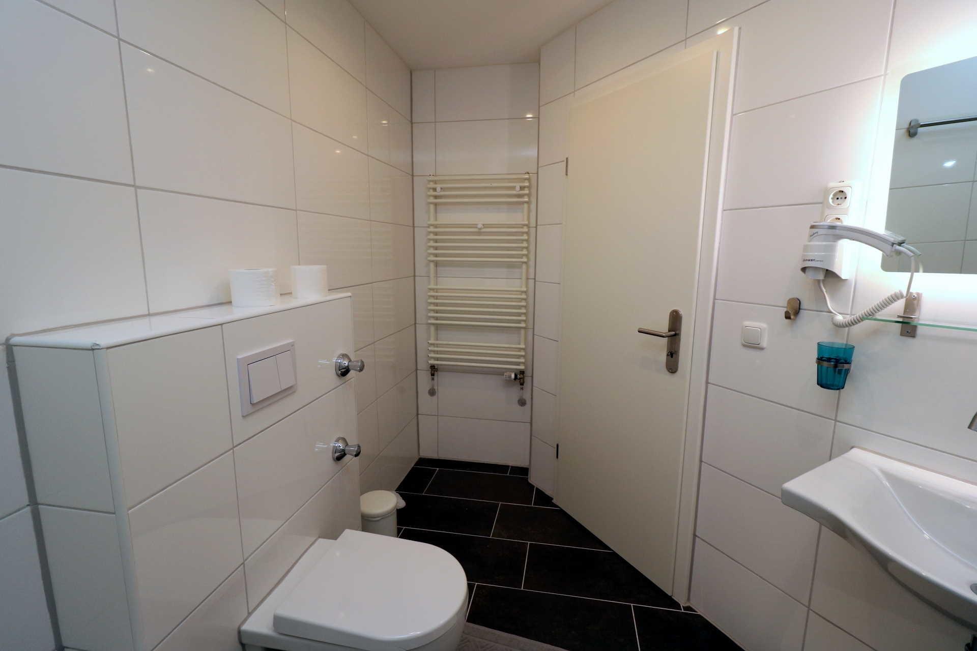 Das Duschbad verfügt über eine ebenerdige Dusche, Waschtisch, beleuchteten Spiegel , Glasablage und WC. Ein Föhn ist ebenfalls vorhanden.