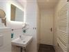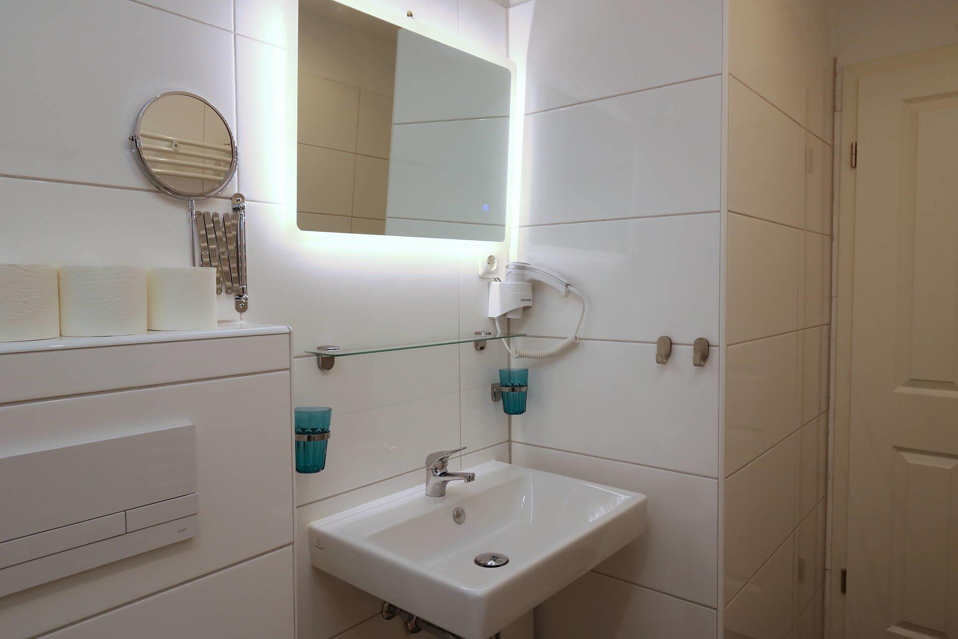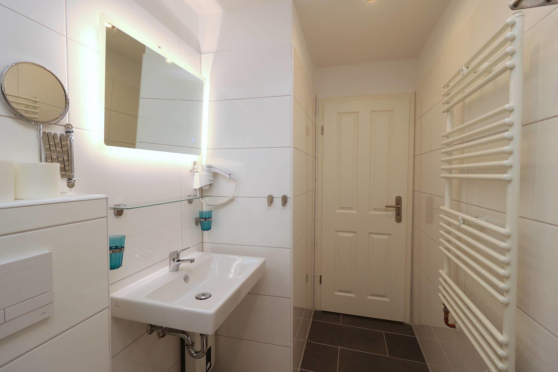 Im Duschbad befinden sich die ebenerdige Dusche, ein Waschtisch mit Glasablage und beleuchtetem Spiegel sowie das WC. Schminkspiegel und Föhn sind ebenfalls vorhanden.