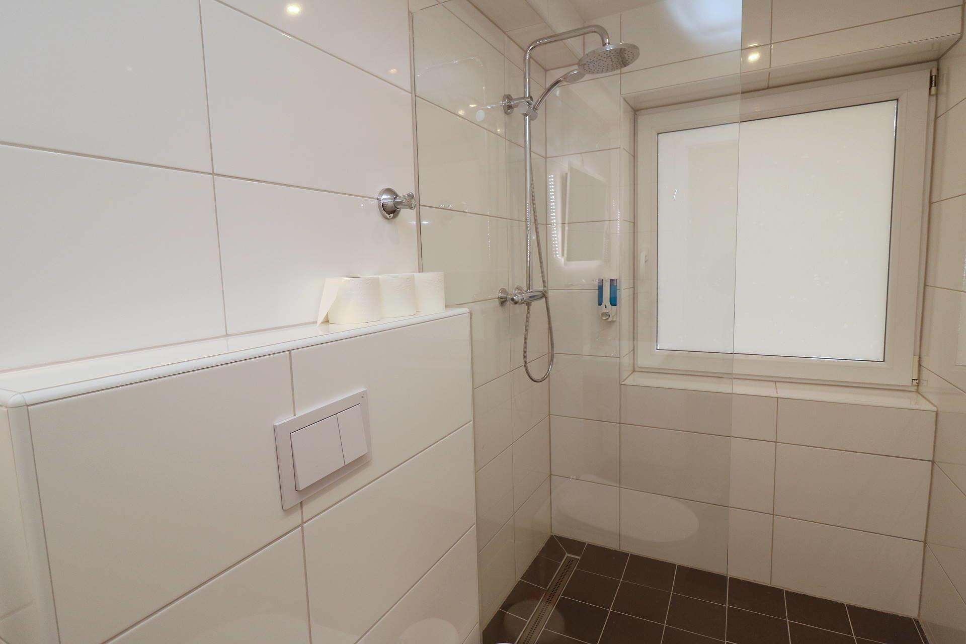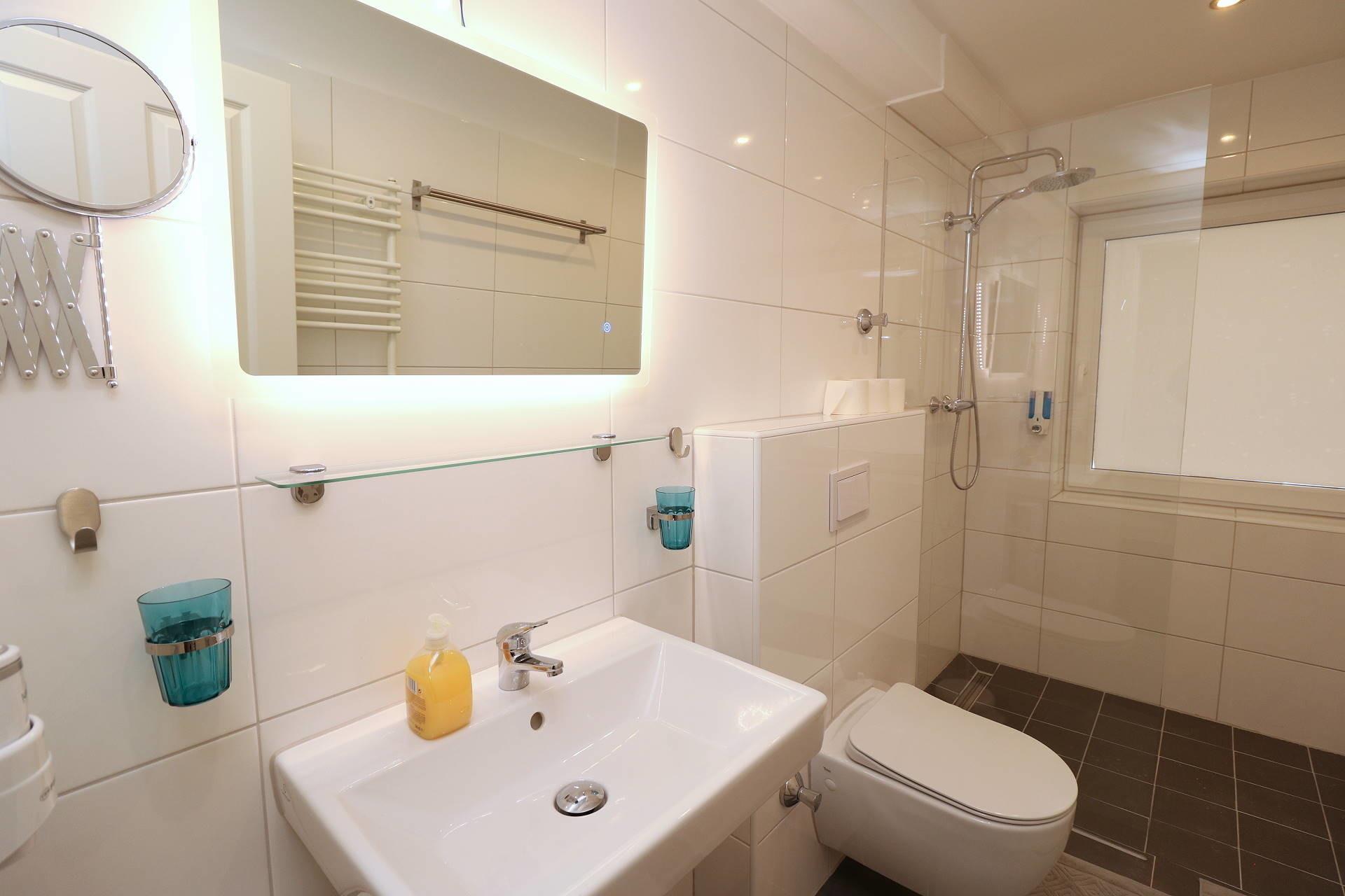 Das Badezimmer besitzt eine ebenerdige Dusche, einen Waschtisch, Glasablage, einen beleuchteten Spiegel und das WC. Schminkspiegel und Föhn sind ebenfalls vorhanden.