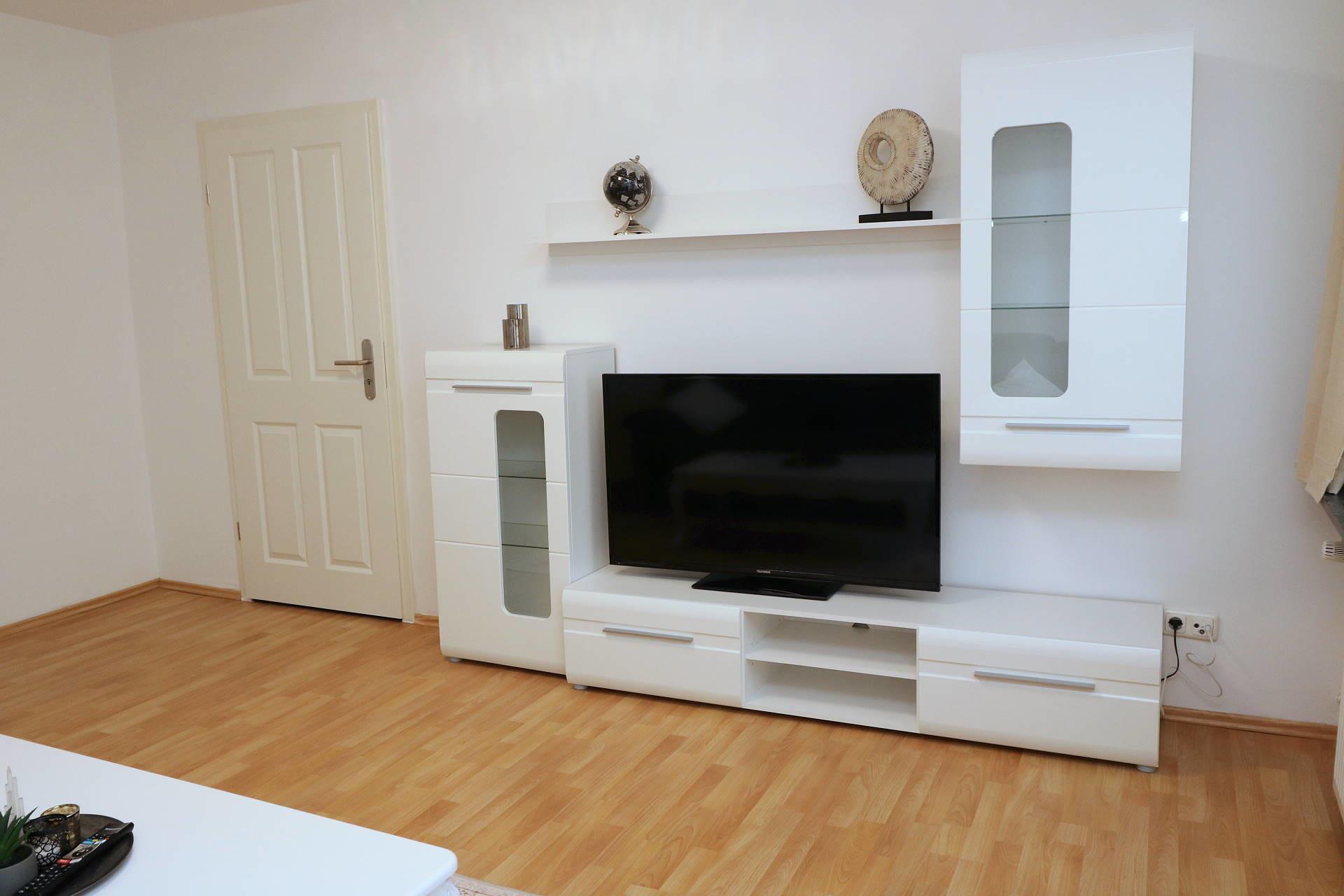 Das Wohnzimmer besitzt ein großes Sofa mit Schlaffunktion, Couchtisch, moderne Schrankelemente und Kabel-TV.