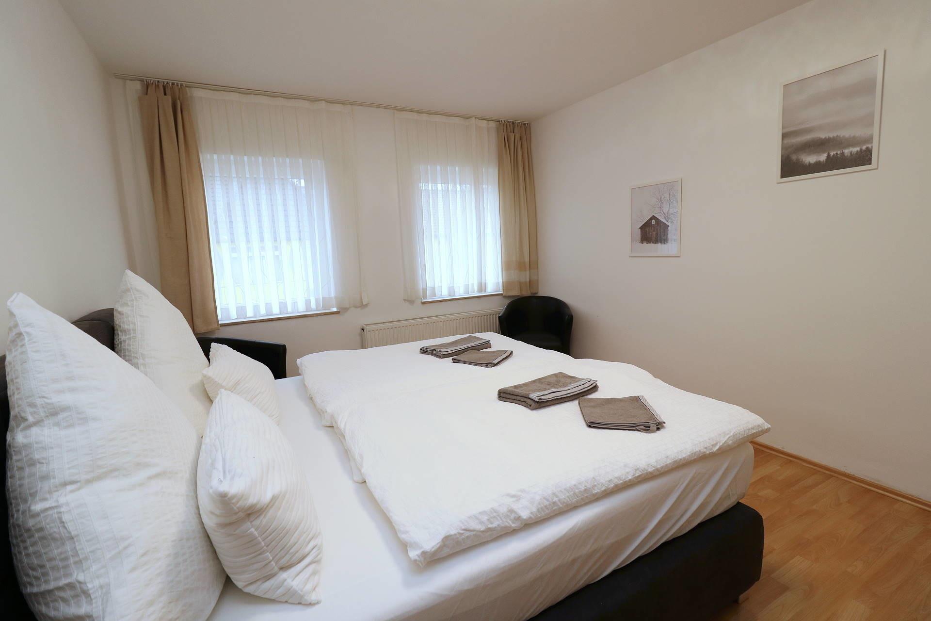 Im Schlafzimmer befindet sich ein Doppelbett, ein 3-türiger Kleiderschrank und 2 Clubsessel.
