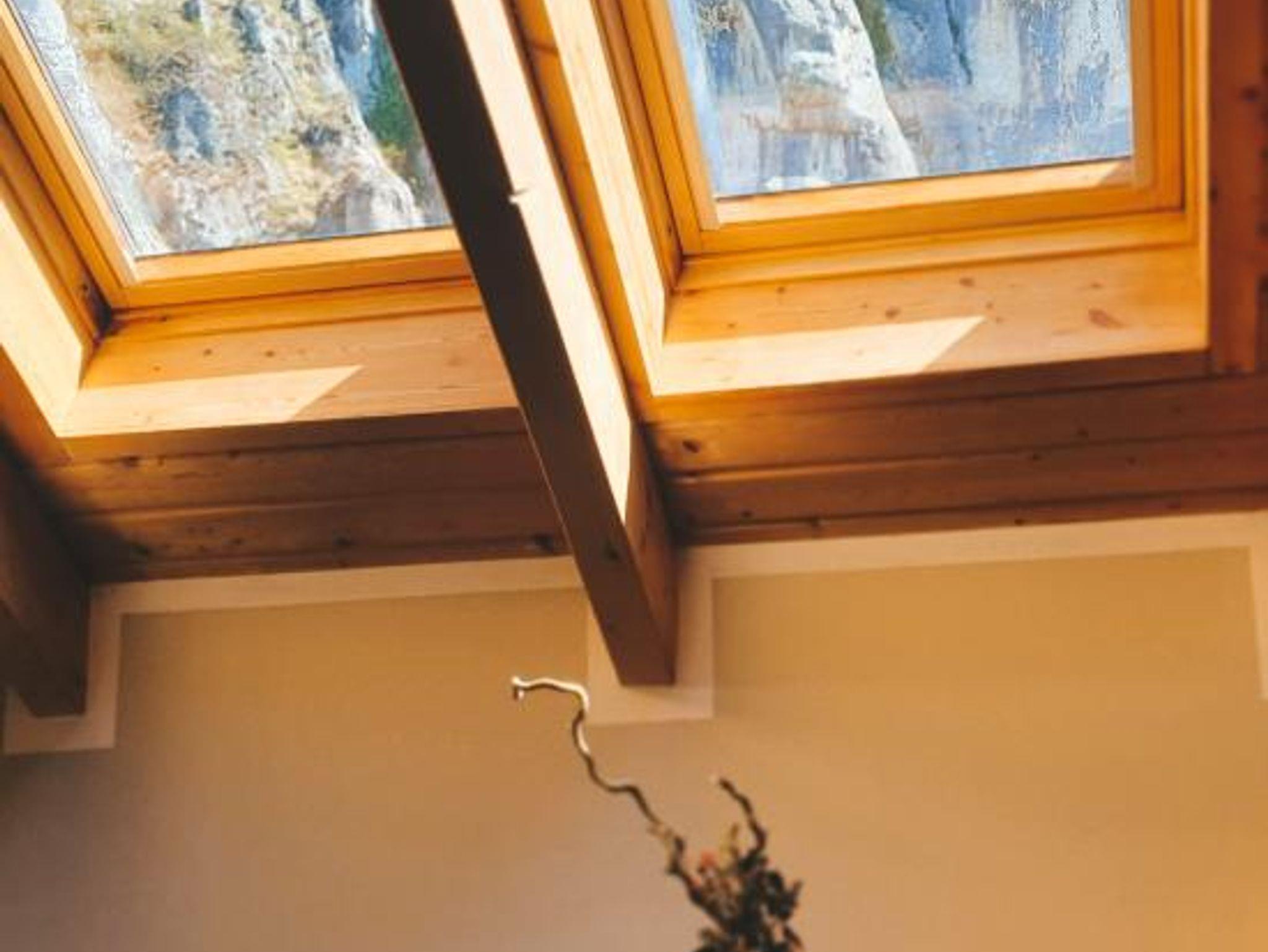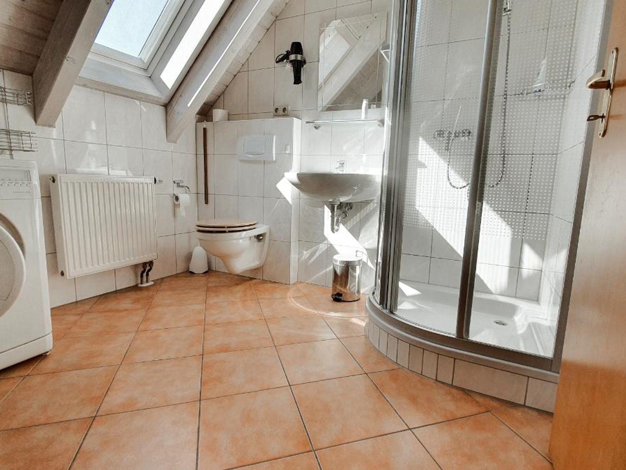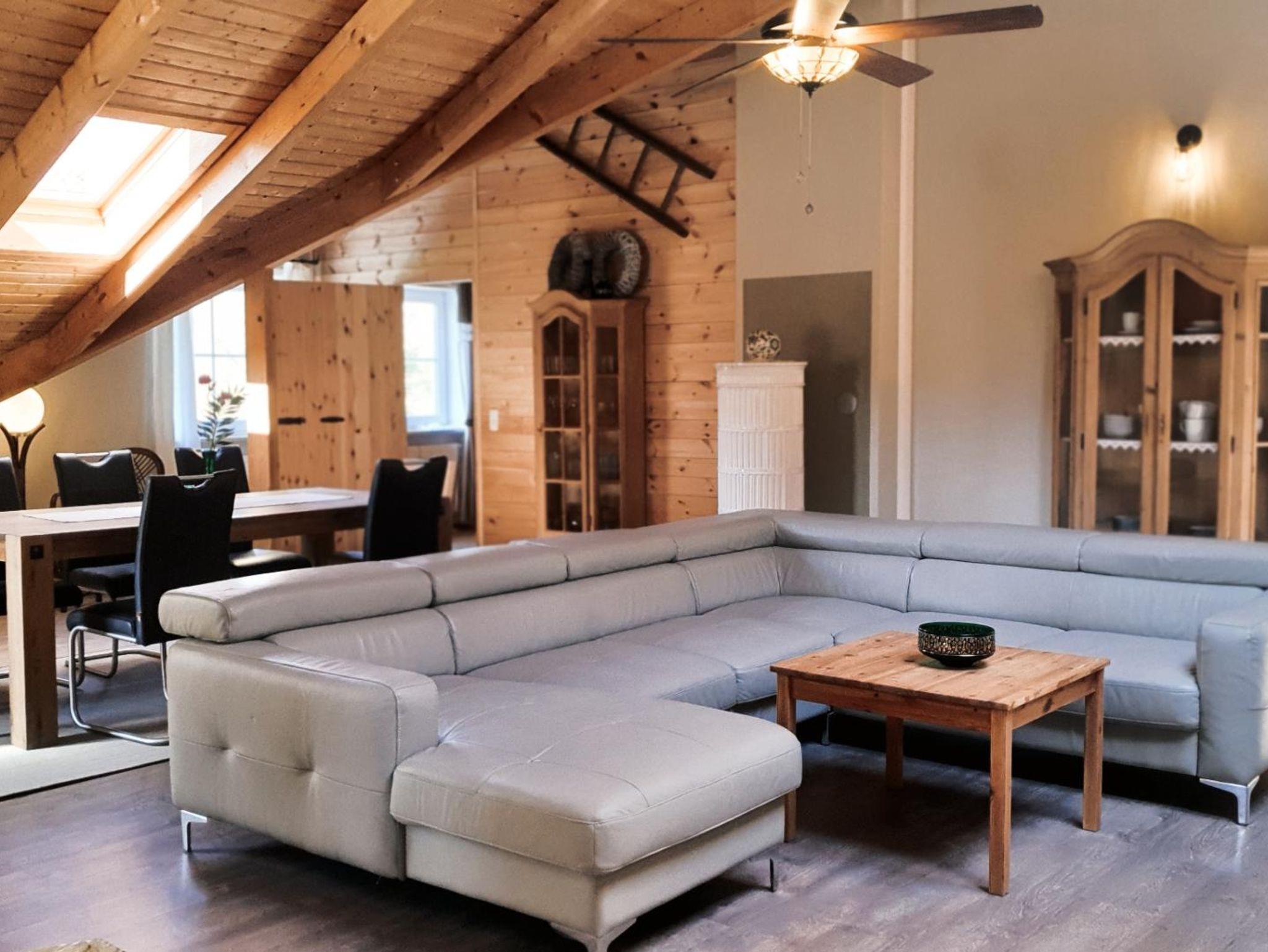 Das Wohnzimmer ist das Herzstück des Penthouses. Von dem hochwertigen Echtledersofa können Sie nach oben durch das Dachfenster die Burg betrachten und in die Sterne blicken. Die offenen Holzbalken des Dachstuhls schaffen in dem großen, lichtdurchfluteten Raum ein gemütliches Ambiente. Bei der Renovierung der Wohnung in 2021 wurde ein Augenmerk auf das harmonische Zusammenspiel zwischen modernen und rustikalen Akzenten gesetzt.