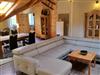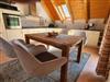 Im Wohnzimmer befindet sich ein großer, massiver Esstisch mit Platz für bis zu 8 Personen, sowie ein moderner 55 Zoll Smart-TV.