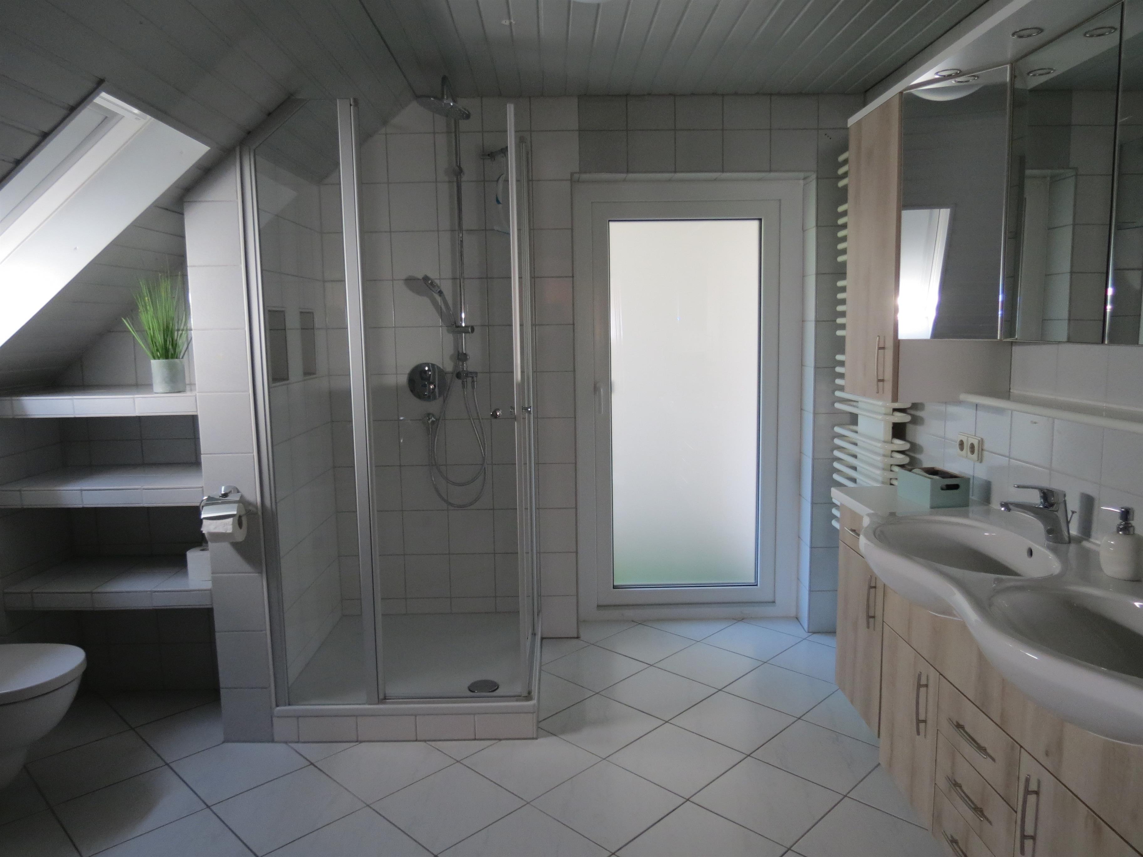 Das Badezimmer ist ausgestattet mit einer komfortablen Eckbadewanne, Doppelwaschbecken, Dusche, WC, Badezimmermöbel mit viel Platz für Ihre Badeutensilien, kleiner Balkon mit Wäscheständer, Fön, Bade- und Handtücher sind vorhanden. Weiterhin gibt es ein separates WC mit Waschmaschine, Trockner.