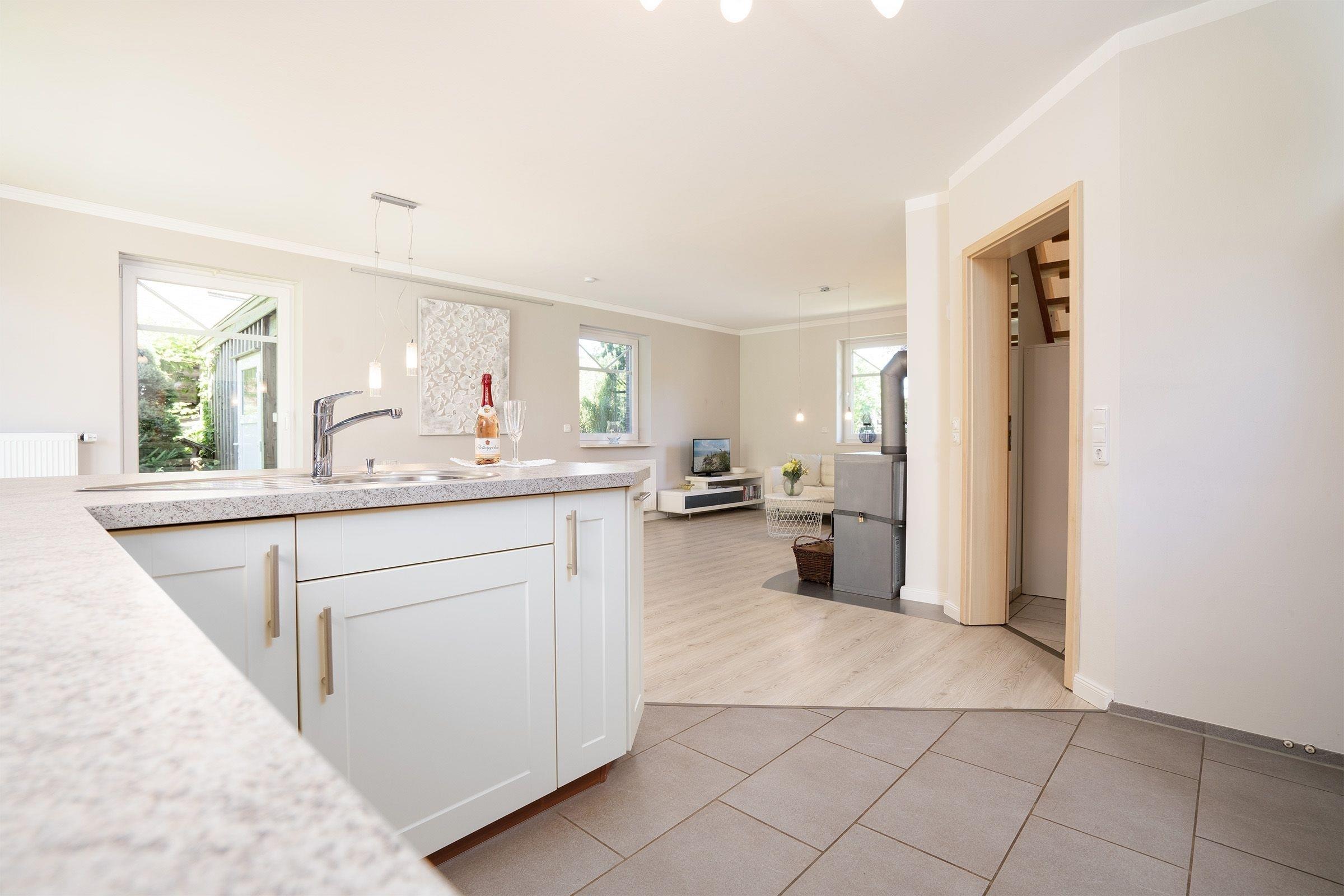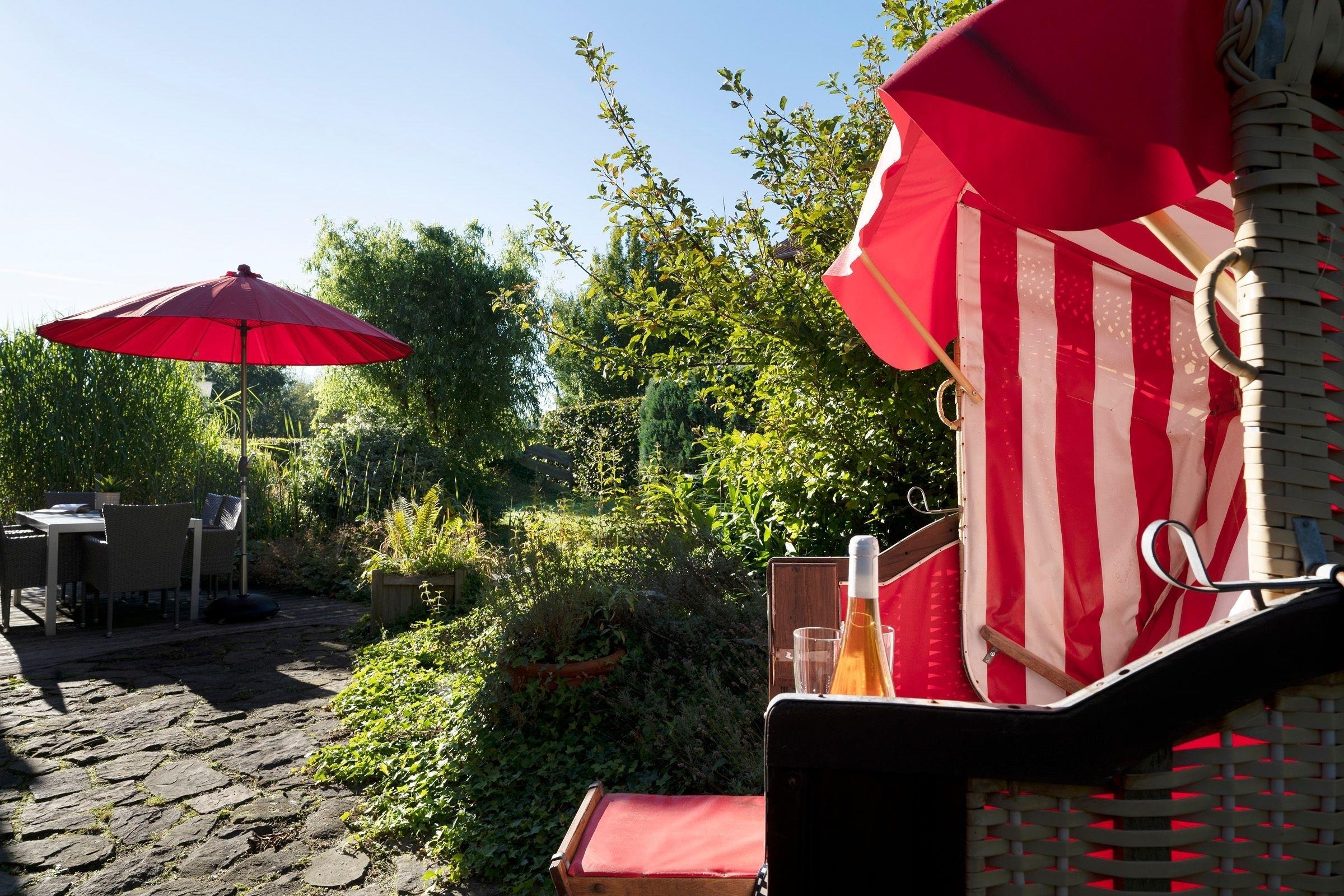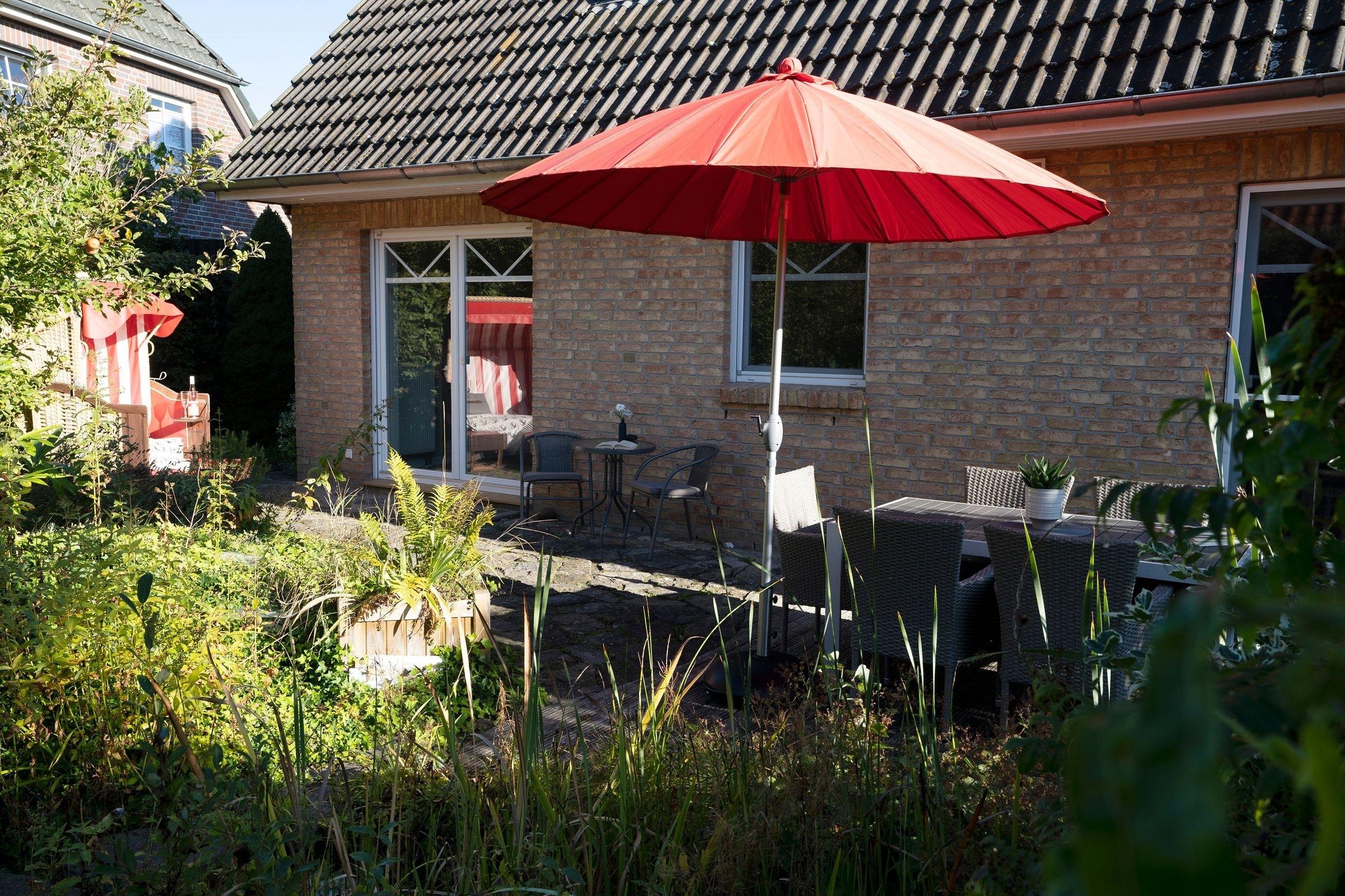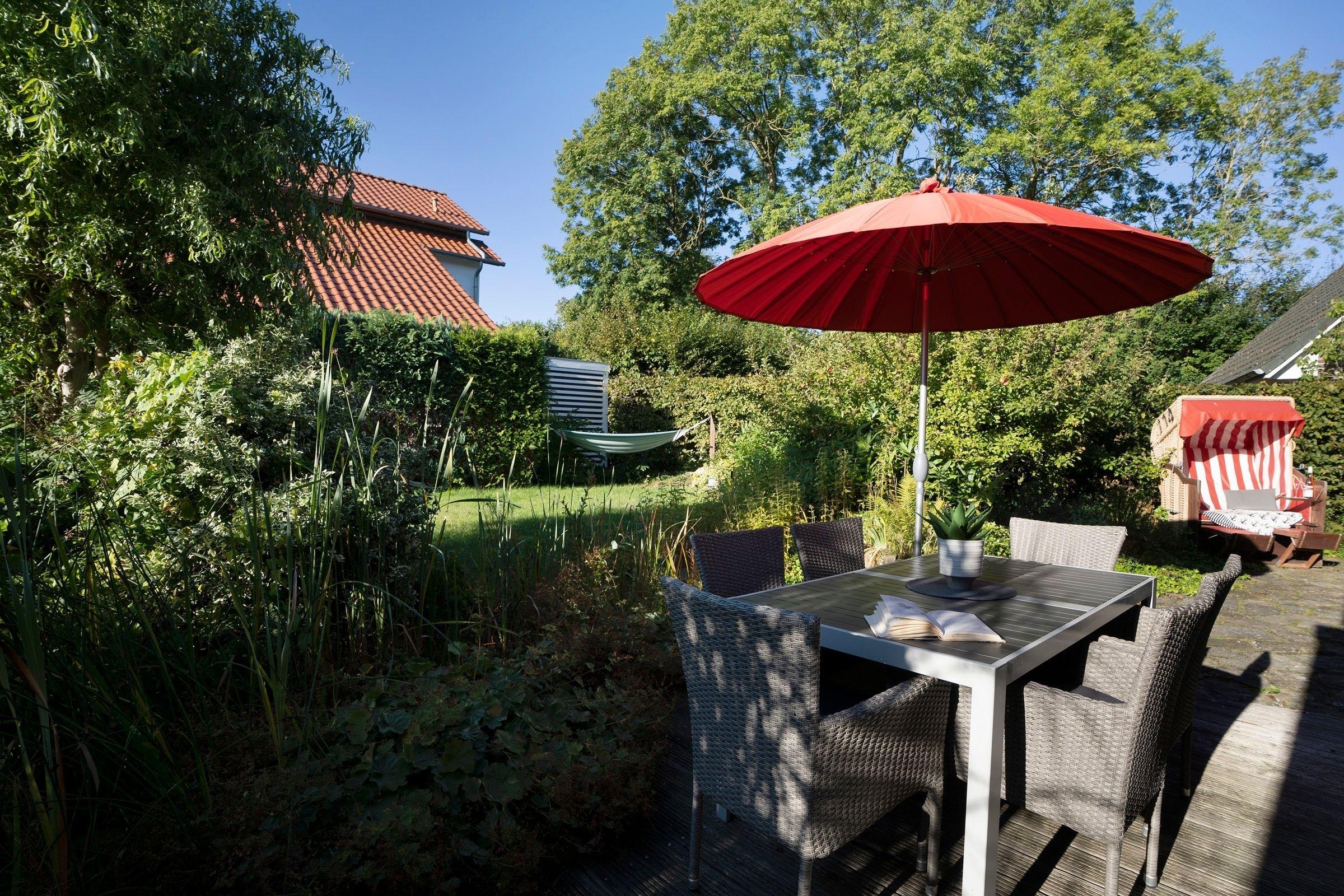 Das Ferienhaus beeindruckt durch ein lichtdurchflutetes Wohnzimmer mit einem Flachbild-TV und einer Sofalandschaft. In der offenen, integrierten Küche bereiten Sie Ihre Mahlzeiten zu und können diese am angrenzenden Essplatz gemeinsam einnehmen. Von hier aus gelangen Sie auf die möblierte Terrasse und in den Garten. Lassen Sie den Tag im Strandkorb oder in der Hängematte ausklingen. Ein Kohlegrill steht für gemeinsame Grillabende bereit. Im 1. Obergeschoss erwarten Sie drei Schlafzimmer, eines davon mit Doppelbett (140x200 cm). Das zweite Schlafzimmer bietet mit zwei Einzelbetten (90 x 200 cm) viel Schlafkomfort. Das letzte Schlafzimmer verfügt ebenfalls über zwei Einzelbetten (je 80 x 200 cm und 90 x 200 cm), wovon ein Bett zu einem weiteren Schlafplatz (80 x 200 cm) ausgezogen werden kann. Alle Schlafzimmer sind mit einem Kleiderschrank und einer Verdunkelungsmöglichkeit (Plissees) ausgestattet, Platz für ein Babybett ist ebenfalls vorhanden. Für das Rundum-Urlaubsgefühl sorgen im Badezimmer eine Fußbodenheizung, die große Eckbadewanne und eine Dusche sowie ein separates Gäste-WC im Erdgeschoss.