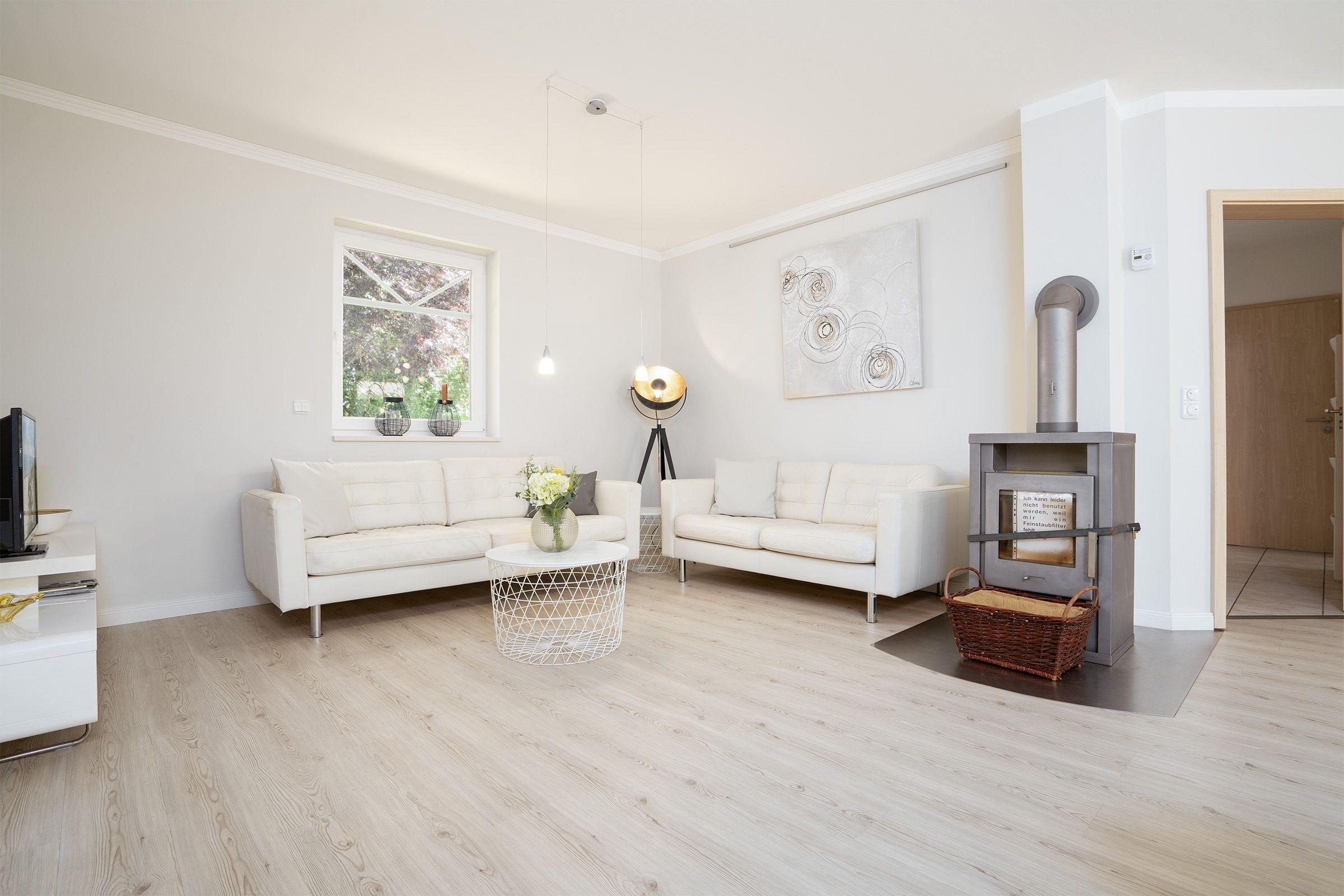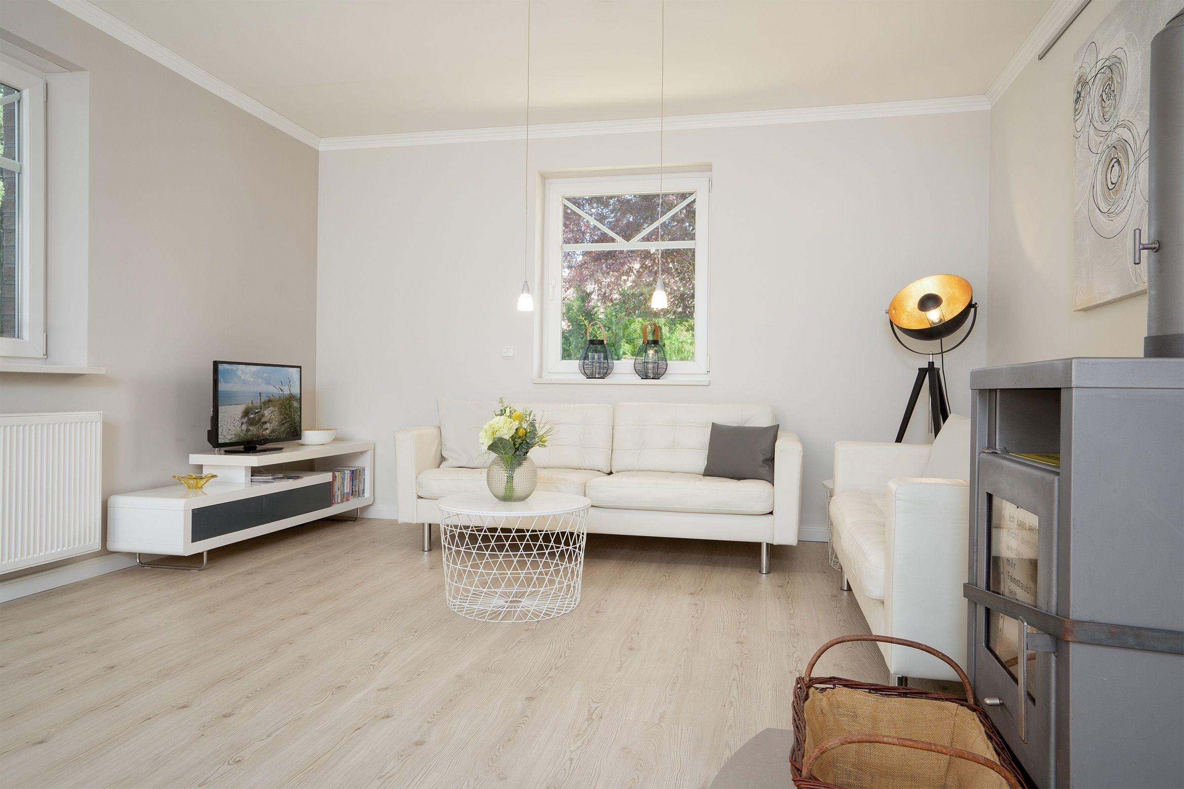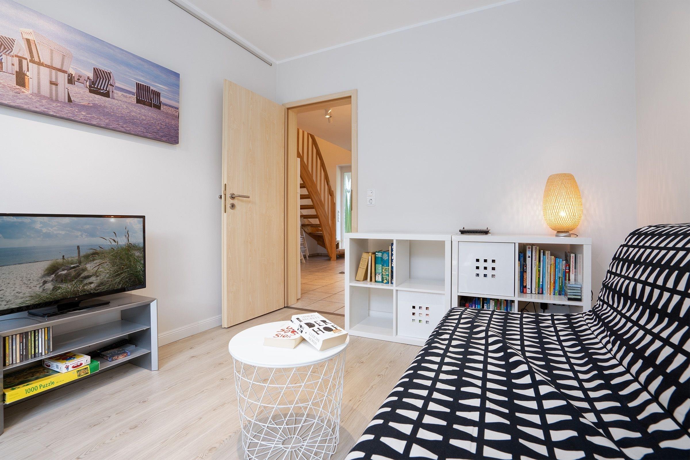 Das Ferienhaus beeindruckt durch ein lichtdurchflutetes Wohnzimmer mit einem Flachbild-TV und einer Sofalandschaft. In der offenen, integrierten Küche bereiten Sie Ihre Mahlzeiten zu und können diese am angrenzenden Essplatz gemeinsam einnehmen. Von hier aus gelangen Sie auf die möblierte Terrasse und in den Garten. Lassen Sie den Tag im Strandkorb oder in der Hängematte ausklingen. Ein Kohlegrill steht für gemeinsame Grillabende bereit. Im 1. Obergeschoss erwarten Sie drei Schlafzimmer, eines davon mit Doppelbett (140x200 cm). Das zweite Schlafzimmer bietet mit zwei Einzelbetten (90 x 200 cm) viel Schlafkomfort. Das letzte Schlafzimmer verfügt ebenfalls über zwei Einzelbetten (je 80 x 200 cm und 90 x 200 cm), wovon ein Bett zu einem weiteren Schlafplatz (80 x 200 cm) ausgezogen werden kann. Alle Schlafzimmer sind mit einem Kleiderschrank und einer Verdunkelungsmöglichkeit (Plissees) ausgestattet, Platz für ein Babybett ist ebenfalls vorhanden. Für das Rundum-Urlaubsgefühl sorgen im Badezimmer eine Fußbodenheizung, die große Eckbadewanne und eine Dusche sowie ein separates Gäste-WC im Erdgeschoss.