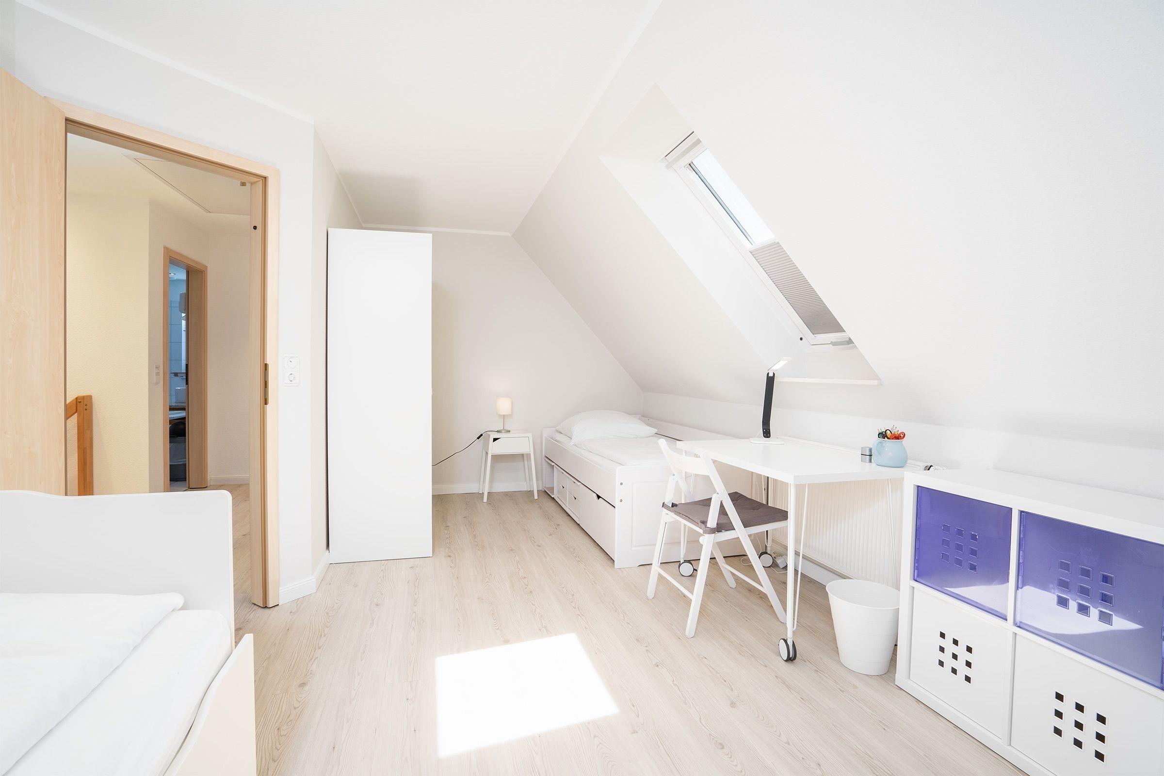 Schlafzimmer 2 (1. OG): 2 Einzelbetten (je 90x200 cm), Kleiderschrank, Verdunkelung (Plissees)