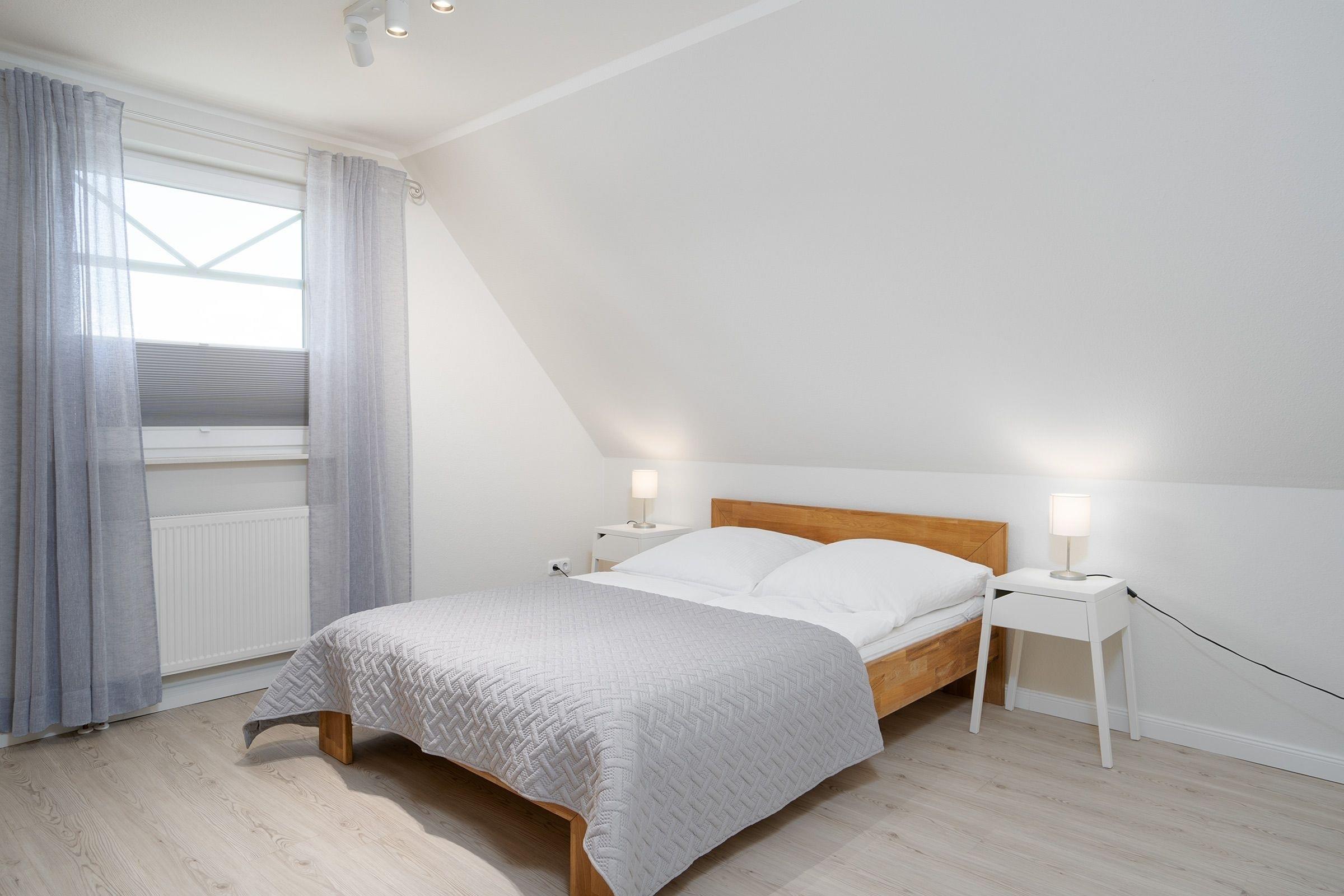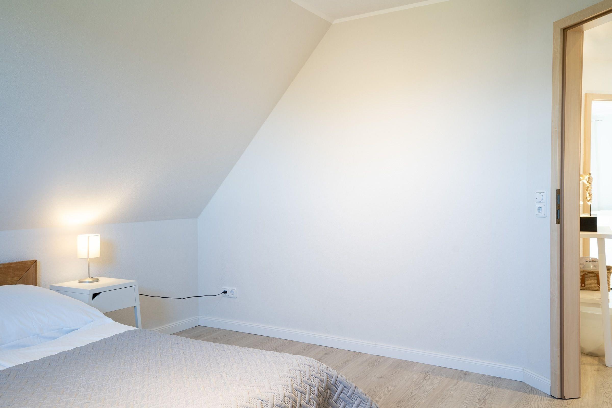 Schlafzimmer 3 (1. OG): 1 Doppelbett (140 x 200 cm), Kleiderschrank, Verdunkelung (Plissees), Kinderreisebett & Wickelvorrichtung vorhanden (steht im Hauswirtschaftsraum, zusammengeklappt)