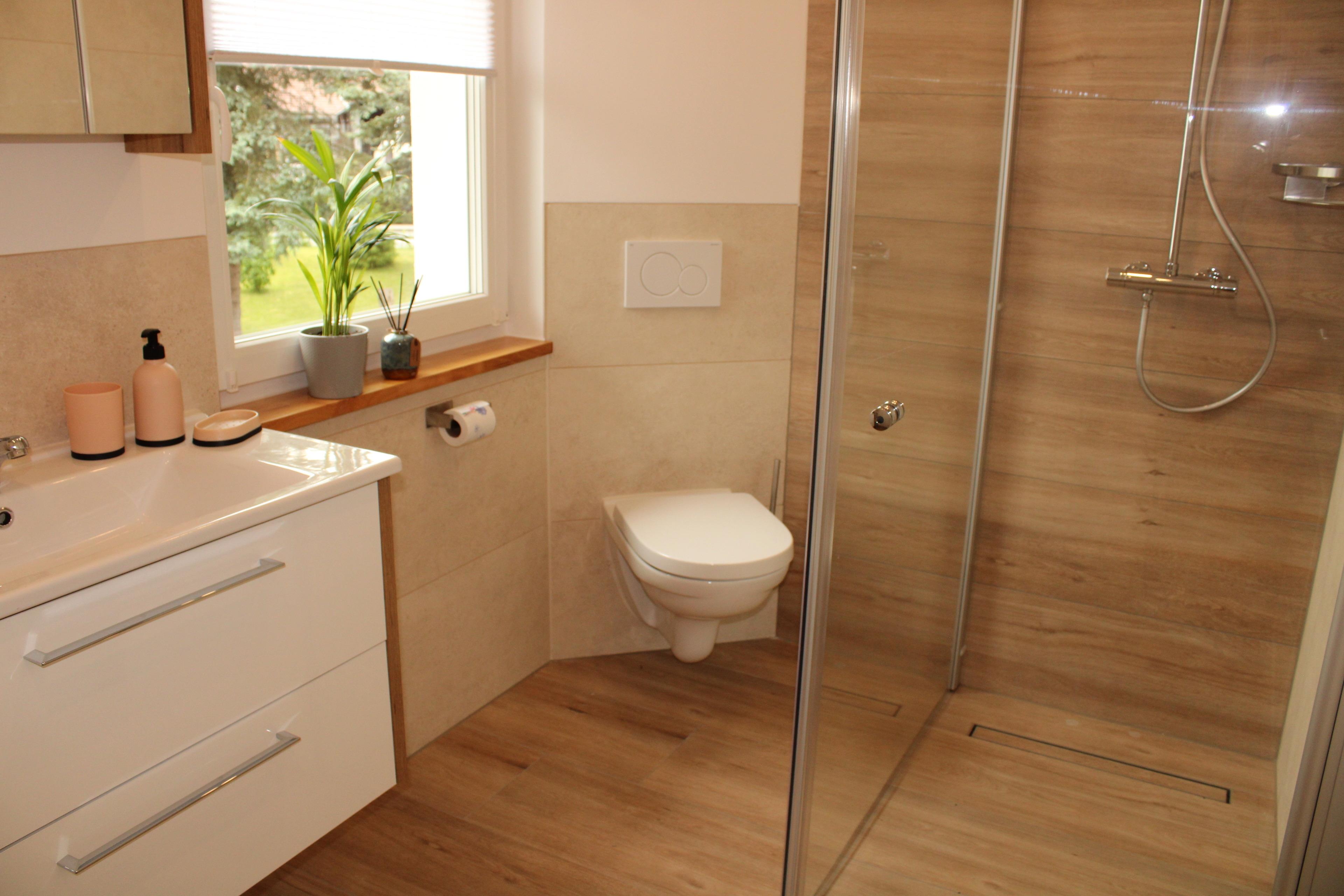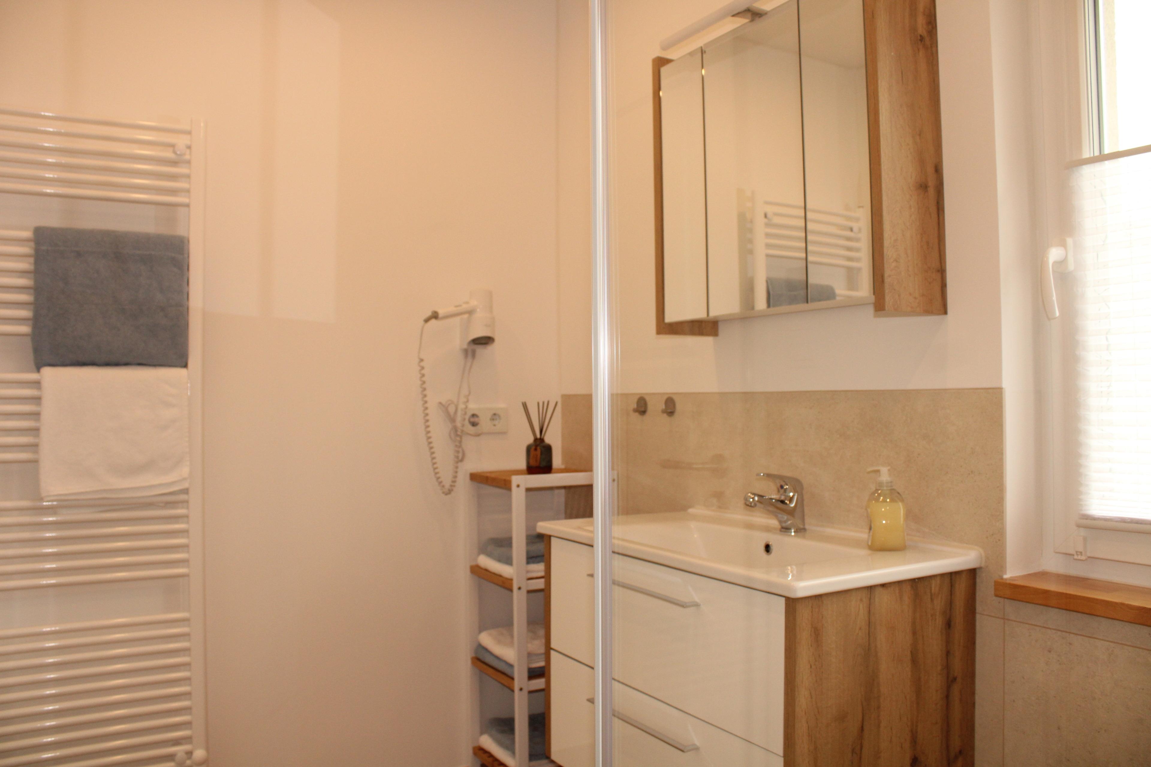 * Bad mit begehbarer Regendusche, WC und Fön