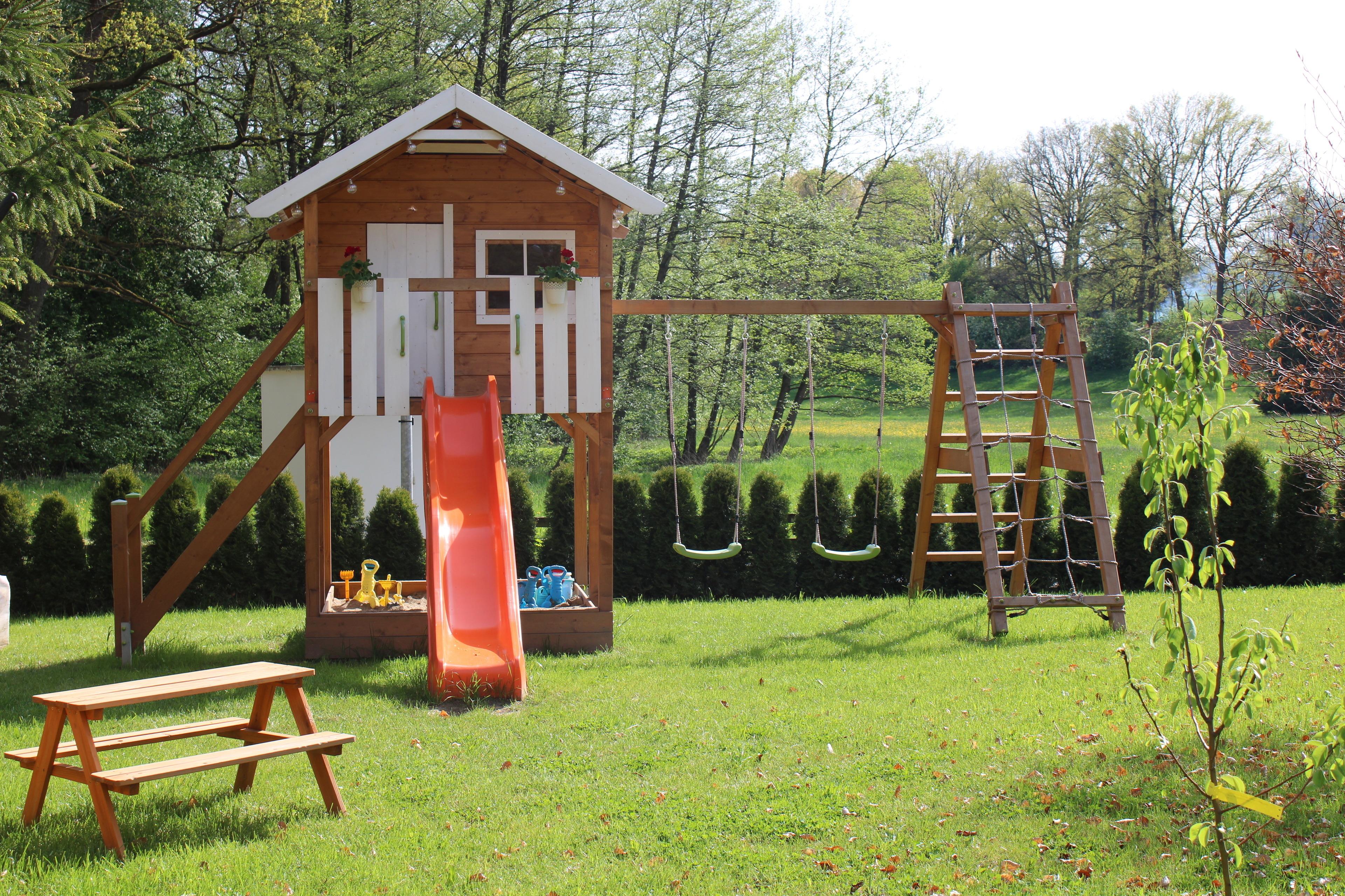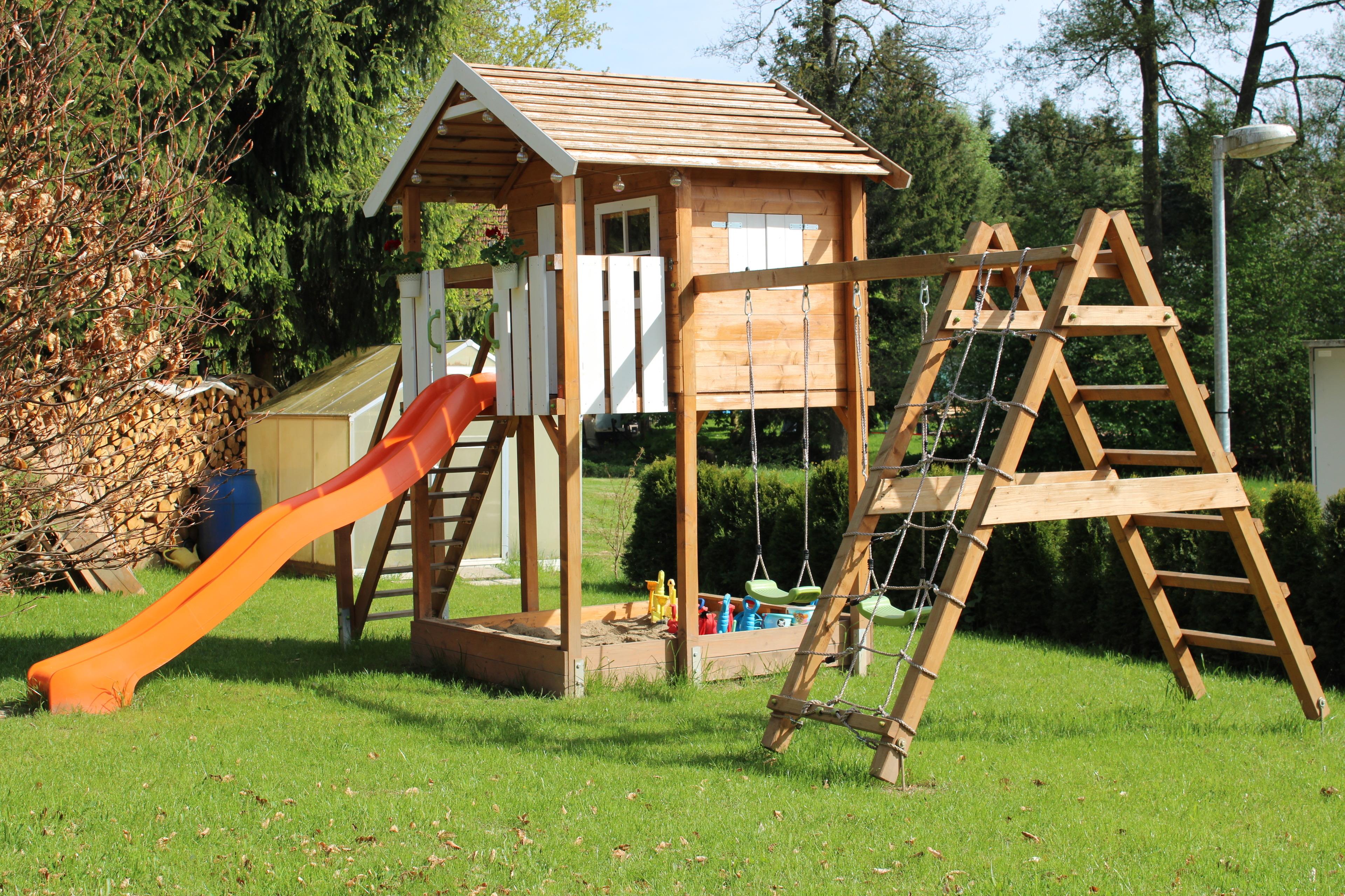 * Gartenmitbenutzung XXL Kinderspielhaus mit Rutsche, Schaukeln, großer Sandkasten, Fußballtor,