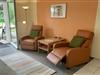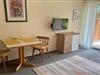 , stue / spisestue(, , tekøkken, Fjernsyn, spisebord, kogeplade, elkedel, brødrister, kaffemaskine, mikrobølgeovn, køleskab, fryser), soveværelse(, , dobbeltseng, Fjernsyn, radio), badeværelse(, toilet, bruser, håndvask), varme, terrasse(, Græsplæne, havemøbler), parkering, tørreskab