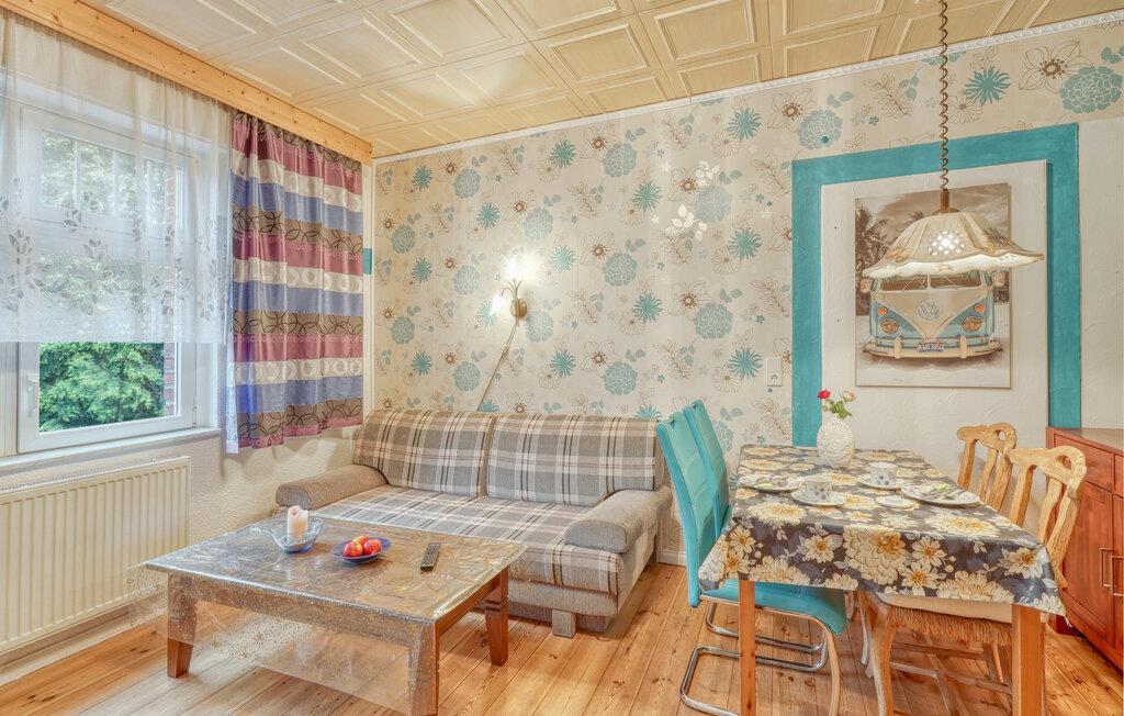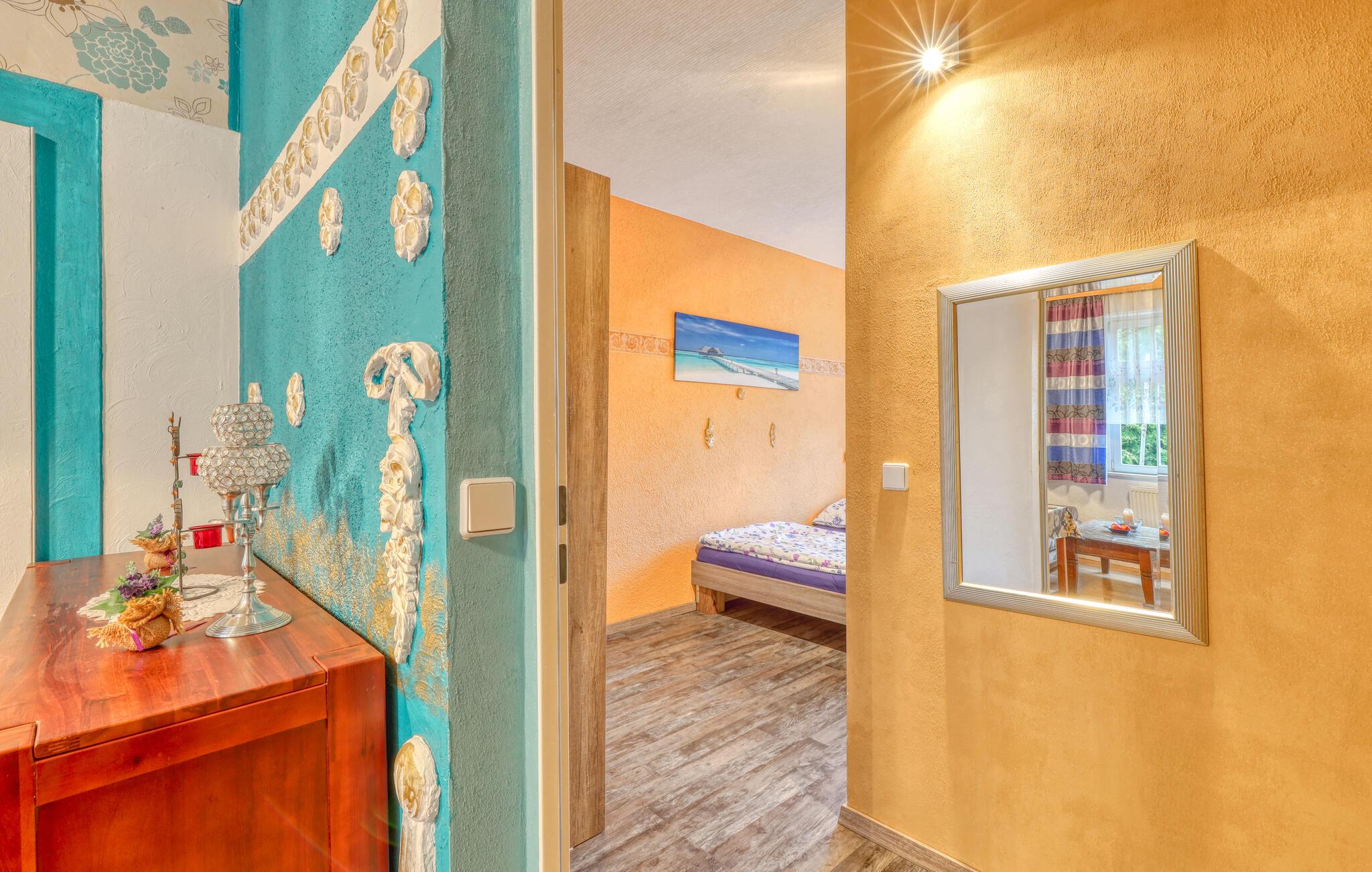 De tre ferielejligheder ligger i ejerboligen på en helt indhegnet grund på omkring 2.500 kvadratmeter rolig beliggenhed i Himmelpfort og har separat indgang. Der er omkring 500 meter til næste svømmeplads. En restaurant og et minimarked ligger også kun få hundrede meter væk. Større butikker og en togstation ligger cirka 8 km væk. Der er også et separat sommerhus (DZV452) på ejendommen. Alle lejligheder har WiFi, opholdsområde på ejendommen med grill, liggestole, cykelrum, bordtennisbord, bålplads, gynge og lille børnezoo samt parkeringsplads. ledig. En robåd er tilgængelig efter anmodning mod et gebyr, og en barneseng og høj stol er også tilgængelige efter anmodning. Slutrengøring og sengetøj er inkluderet i den samlede pris. Betales lokalt: el og vand efter forbrug, robåd (hvis relevant) 10 EUR/dag. Medbring venligst dine egne håndklæder. Kæledyr er ikke tilladt i denne ejendom. Den cirka 45 kvadratmeter store ferielejlighed kan rumme op til 4 personer (inklusive 2 ekstra senge) og ligger på husets øverste etage (tilgængelig via trapper). Lejligheden er indrettet med opholdsstue med polstrede møbler (sovesofa), pejs, fladskærms-tv, radio, dvd-afspiller og åbent køkkenalrum med el-komfur og ovn, køleskab med fryser, diverse små køkkenmaskiner og spiseplads som f.eks. samt et separat soveværelse med dobbeltseng (1,40 m bred) og 1 badeværelse med toilet, bruser og hårtørrer. Lejligheden har elvarme og insektbeskyttelse foran vinduerne. Rygning er kun tilladt udendørs. Barneseng og høj stol er kun tilgængelige efter anmodning! En mikrobølgeovn er tilgængelig, hvis det kræves, men bruges ligeligt af alle gæster i de forskellige lejligheder. Himmelpfort er et statsanerkendt feriested i Brandenburg og ligger mellem flere søer. Himmelpfort er en idyllisk landsby midt i naturparken Uckermärkische Seen med små butikker, restauranter og mange turistattraktioner. Det drejer sig blandt andet om klosterhaven med interessant information om lægeplanter og urter, passagerbådsture på vandet, padle- og bådture, tømmerflådeture, trolleyture og lystfiskere får også noget for pengene i de vandrige omgivelser. Vandvandrere kan planlægge deres ture i regionen via de forskellige søer op til Havel og dermed længere nedstrøms. Langdistancecykelstien Berlin-København går gennem byen Himmelpfort er også kendt som en julelandsby langt ud over landets grænser. Hvert år i adventstiden valfarter mange besøgende til byen for at besøge julemanden og de julemarkeder, der finder sted. Det officielle juleposthus ligger også i Himmelpfort. Hundredtusindvis af ønskelister fra børn ankommer der hvert år. I det omkringliggende område er der større byer som Fürstenberg/Havel (ca. 10 km) eller Lychen (ca. 12 km), som har mange butikker, caféer, restauranter og seværdigheder at byde på.