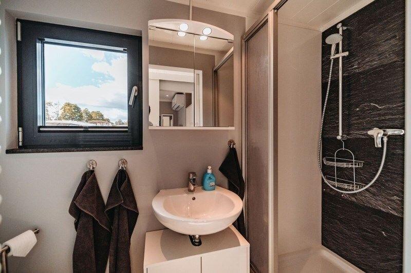 Das Hausboot „Enola“ besitzt 1 Schlafzimmer mit einem Doppelbett und ein Schlafzimmer mit einem Etagenbett. Im Wohnbereich befindet sich ein Schlafsofa. Dieses bietet Platz für eine weitere Person. Das Badezimmer ist mit einer Dusche, WC und Waschtisch ausgestattet. Der Wohn- und Essbereich ist ein stilvoll eingerichteter Raum mit einer dreiseitigen Glasfront.