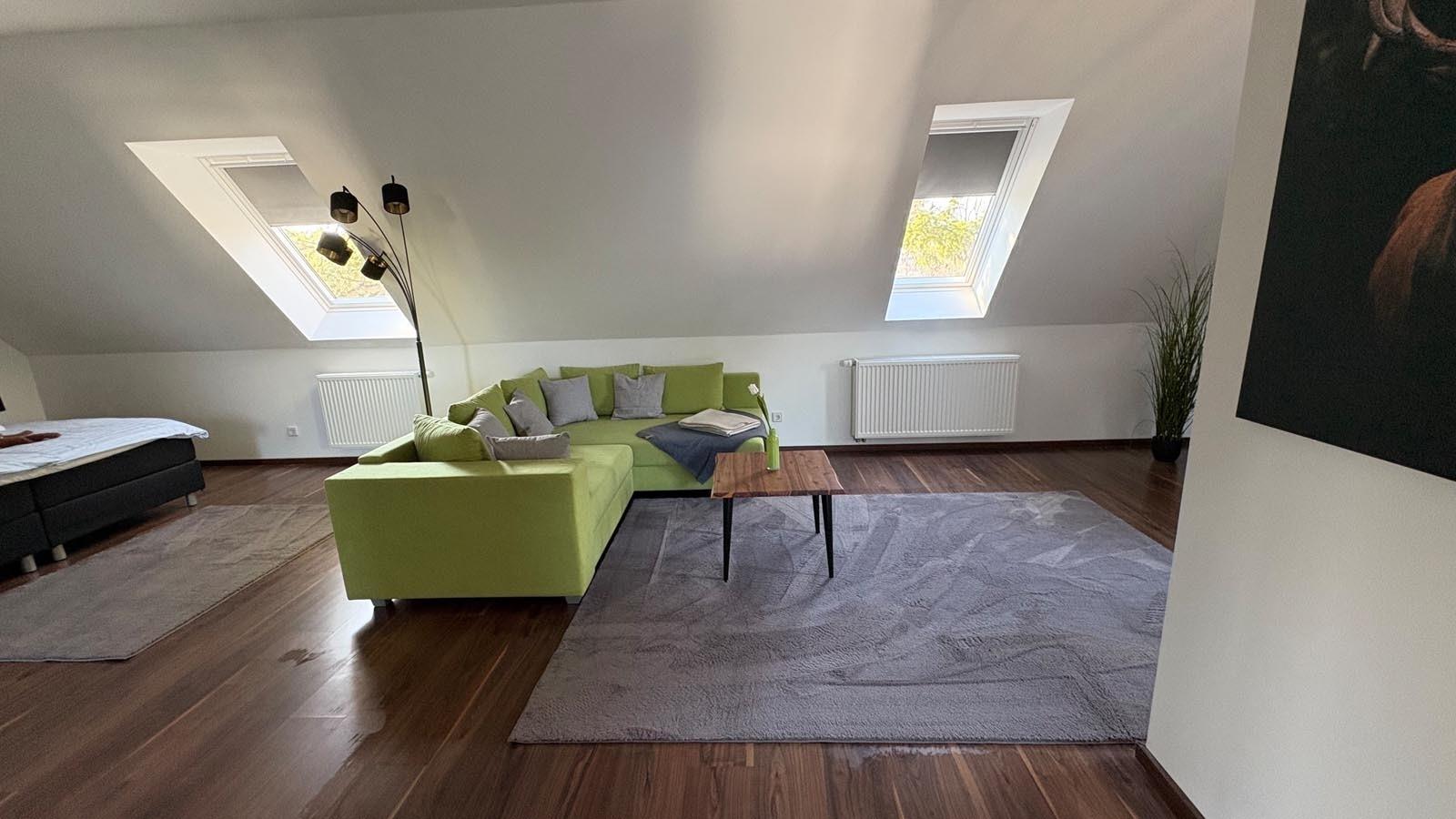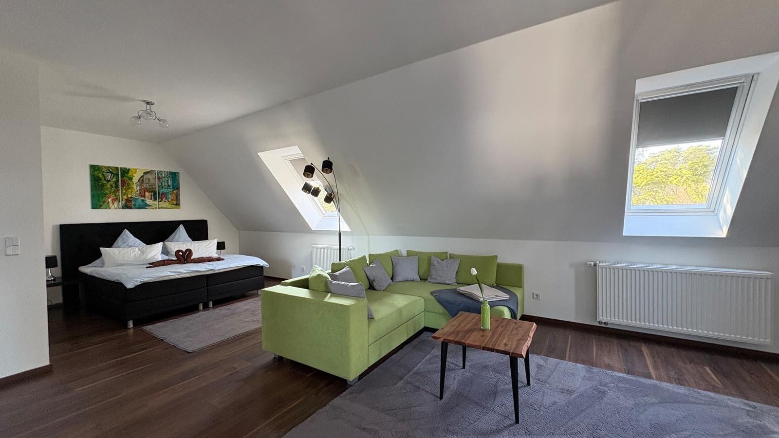 Die Unterkunft eignet sich für bis zu 4 Personen. Im kombinierten Wohn- und Schlafbereich verfügt die Ferienwohnung über ein Boxspring-Doppelbett und eine Schlafcouch.