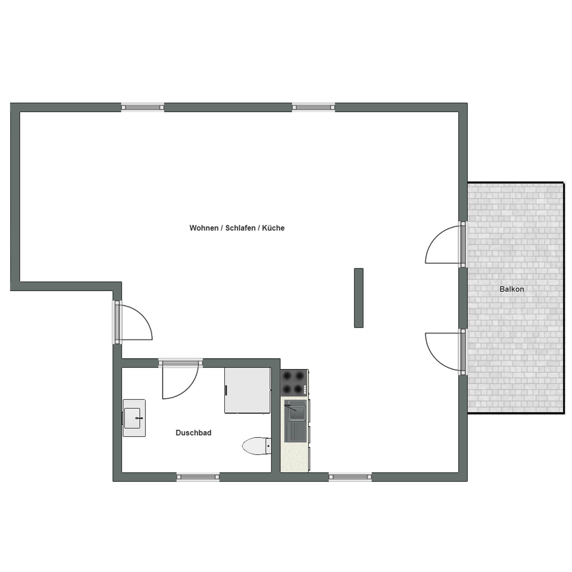 Die Ferienwohnung befindet sich im Dachgeschoss und bietet auf einer Fläche von ca. 55 m² ausreichend Platz für einen erholsamen Aufenthalt. Sie umfasst einen kombinierten Wohn- und Schlafbereich mit integrierter Küche, ein Dusch-Bad und einen Balkon.