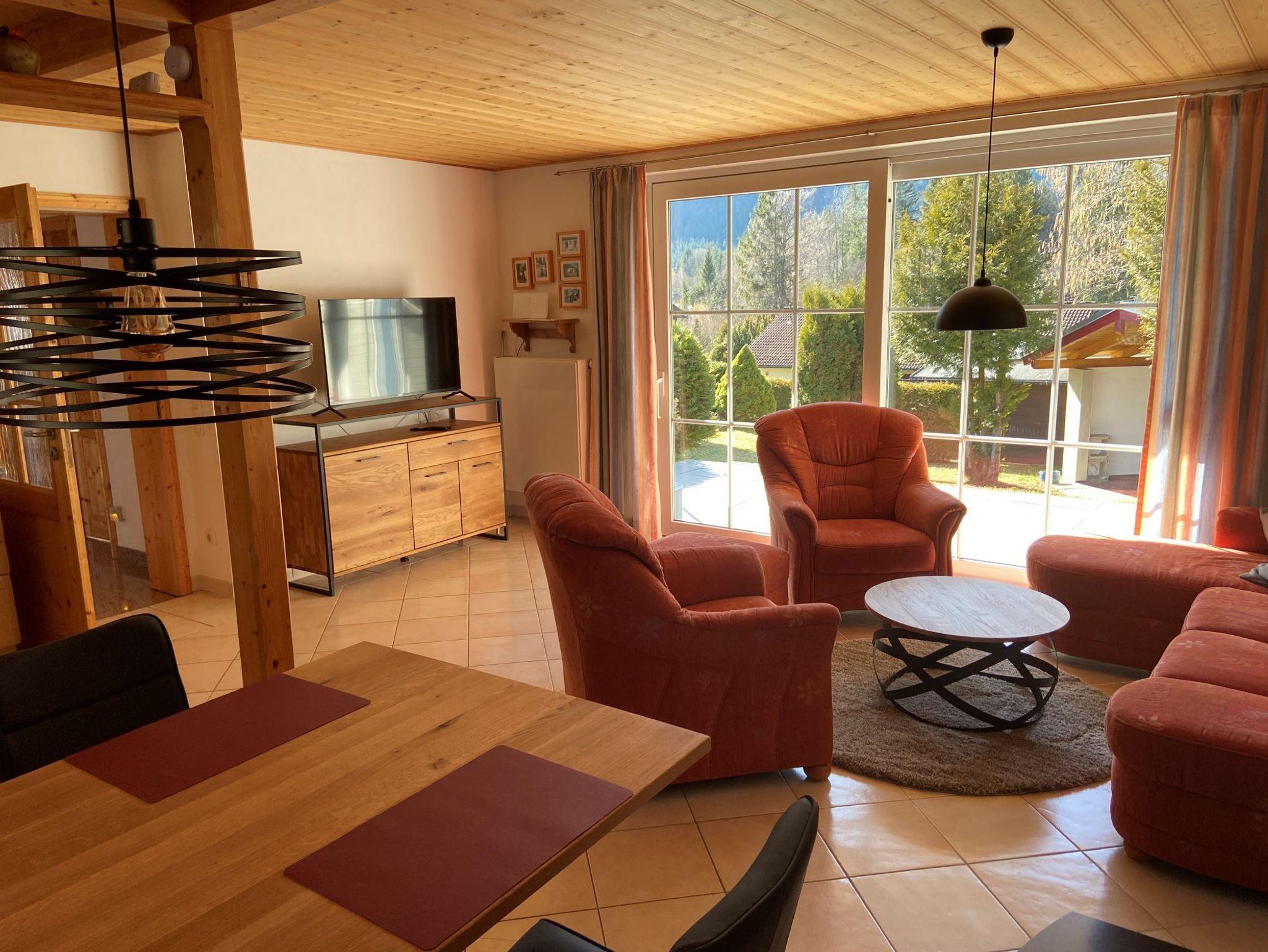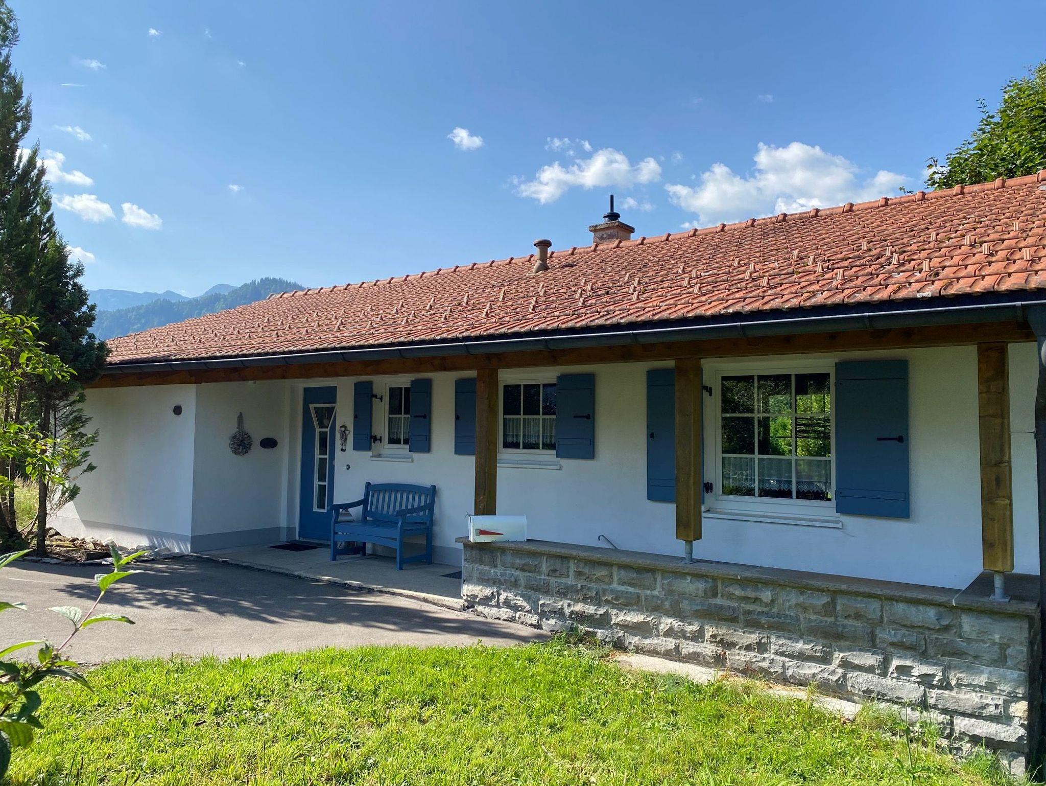 Die Terrasse weist nach Süden mit Blick auf die Berge und in den Garten. Genießen Sie bereits morgens zum Frühstück in einer geschützten Kaminecke die Sonne. Ideal um die Seele baumeln zu lassen.