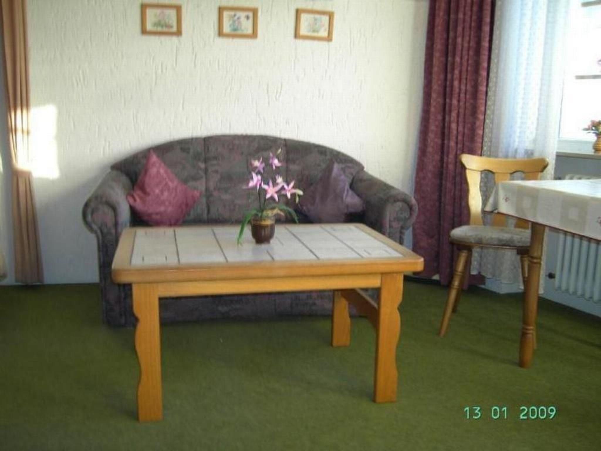 Inside, the flat awaits you with cosy and practical furnishings. The living area has laminate flooring and a comfortable carpet, while the kitchen in the hallway has a tiled floor. You will find everything you need for your daily needs in the fully equipped kitchen. A restful night's sleep is guaranteed in the bedroom, which is partitioned off by a curtain and has a reading light by the beds, surrounded by a cosy atmosphere with laminate flooring and artfully selected pictures.