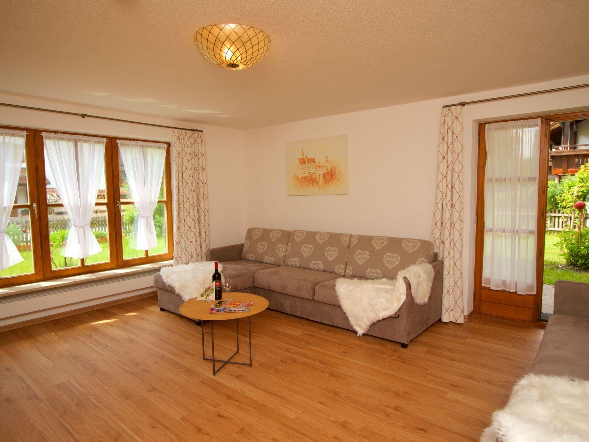 Das Apartment Neuschwanstein befindet sich im Erdgeschoss mit überdachter Süd-West-Terrasse und Garten.
