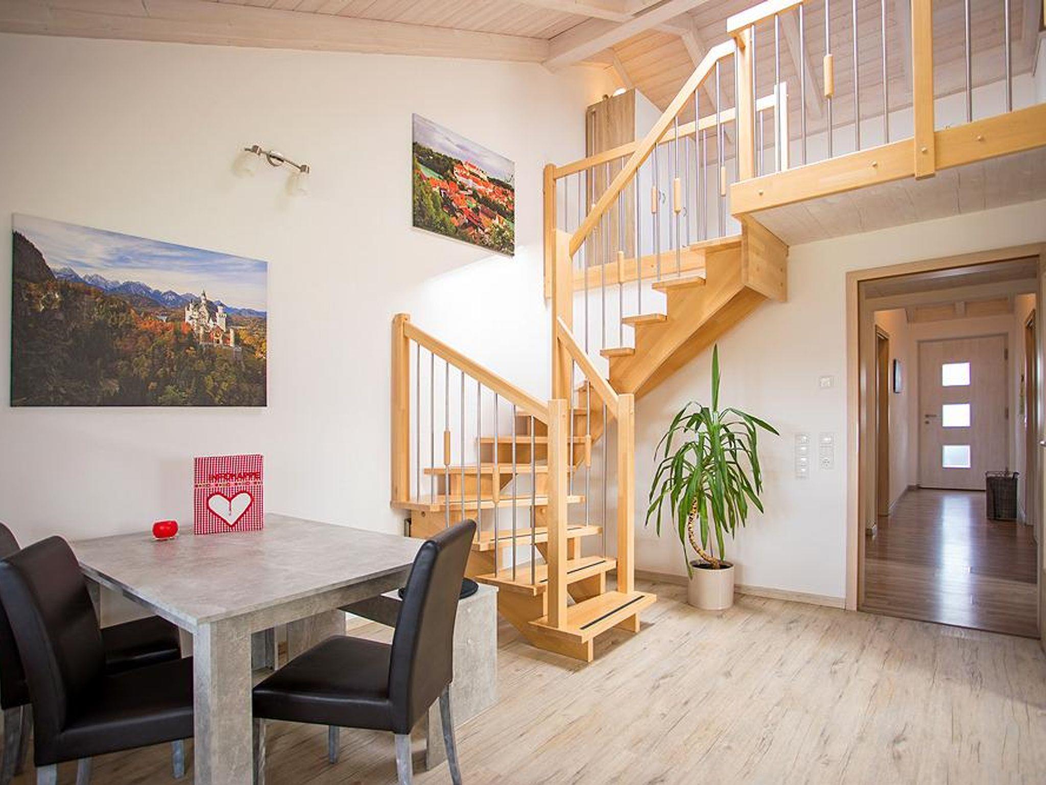 Die 72qm große Ferienwohnung befindet sich in einem Niedrigenergiehaus. Dieses liegt im hügeligen Voralpenland zwischen Füssen und Hopfen am See. Hier erleben Sie herrliche Ruhe und eine schöne Landschaft mit Wiesen, Wälder, Badeseen und Bergen. Ideal zum Wandern, Radeln, Reiten, Spazierengehen und Schwimmen. Das Schloß Neuschwanstein, der Forggensee und verschiedene Bergbahnen sind nur wenige Autominuten von der Ferienwohnung entfernt. Die großzügigen Räume der Ferienwohnung bieten Platz für bis zu sieben Personen, und der Südbalkon lädt zum Entspannen ein. Die Königscard ist auch dabei! Mit dieser können Sie viele tolle Ausflüge und Aktivitäten ohne Zuzahlung erleben.