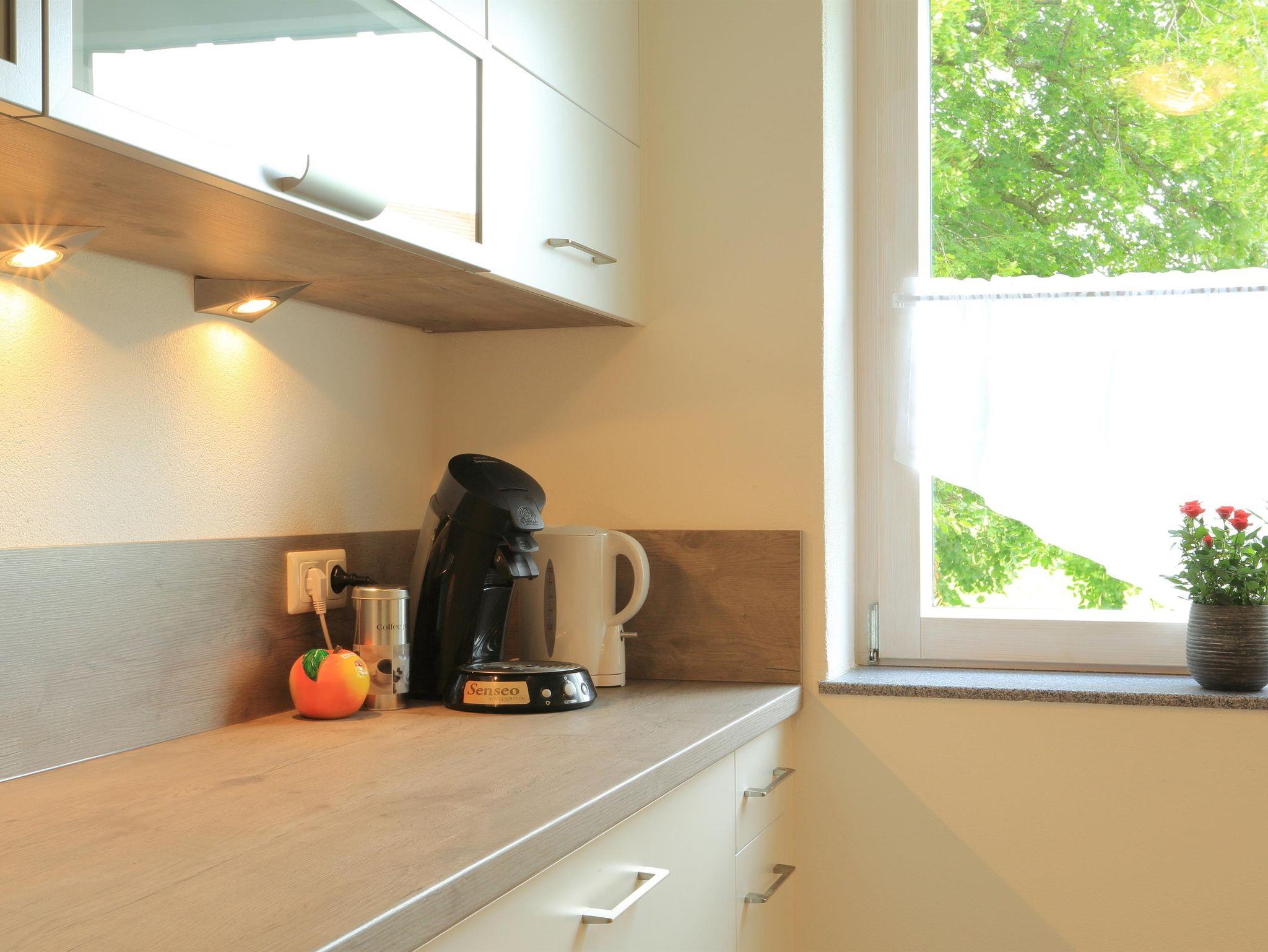 In der geräumigen und hochwertigen Einbauküche finden Sie eine Spülmaschine, ein Ceran-Kochfeld, einen Backofen, einen Gefrier- und Kühlschrank, sowie eine Pad-Kaffee-Maschine, Toster, Eierkocher und vieles mehr.