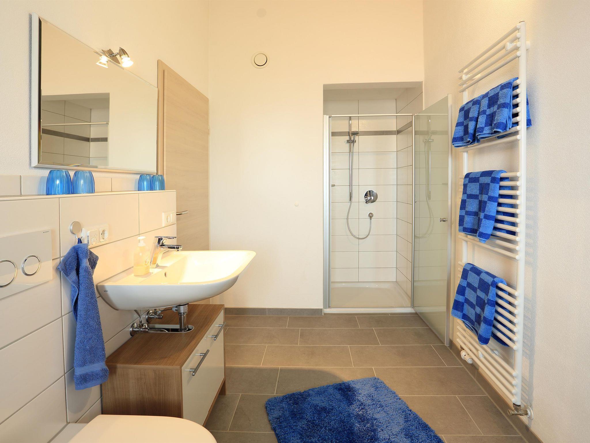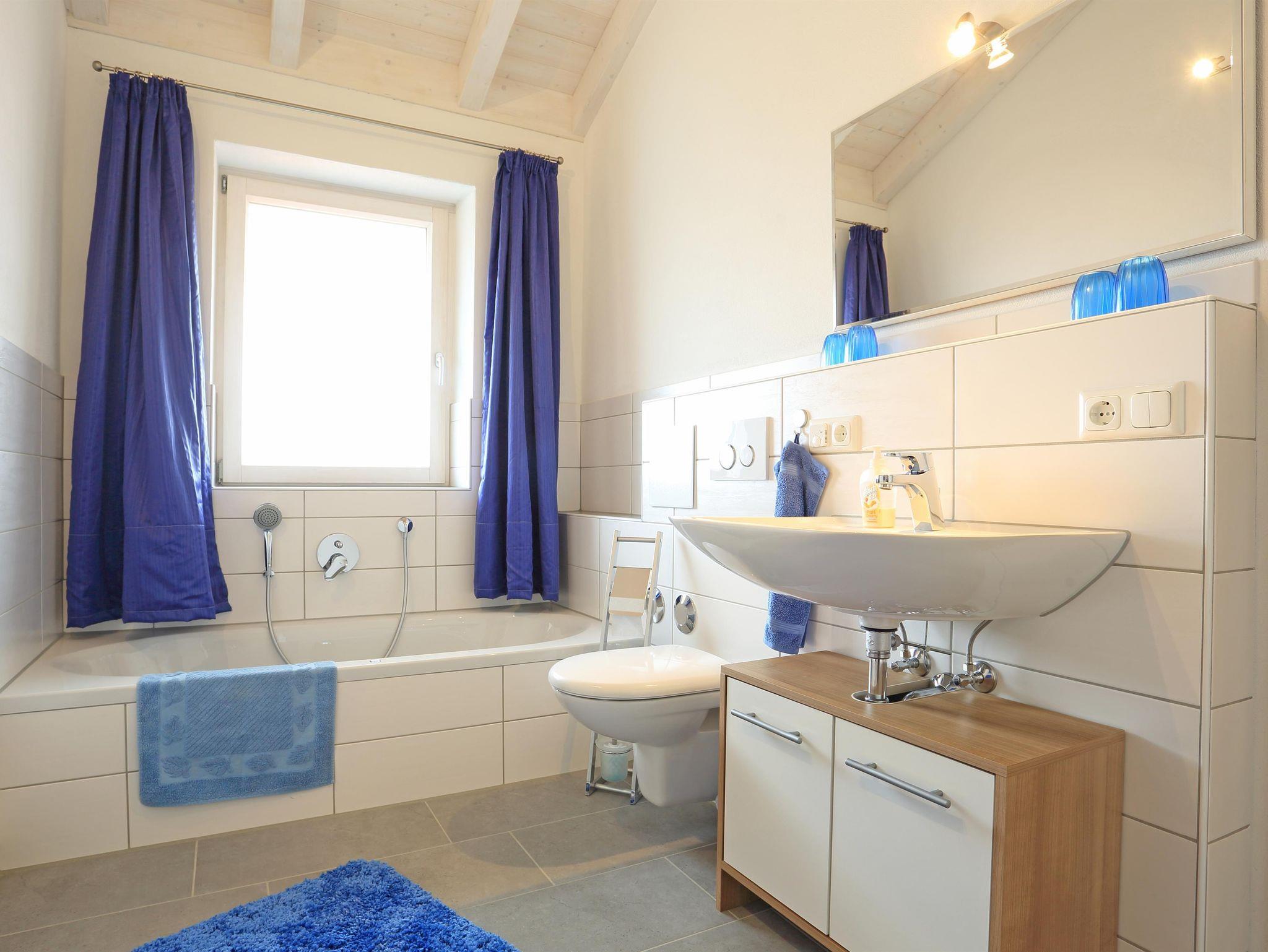 Das helle Badezimmer ist mit einer Badewanne, Dusche und WC ausgestattet.