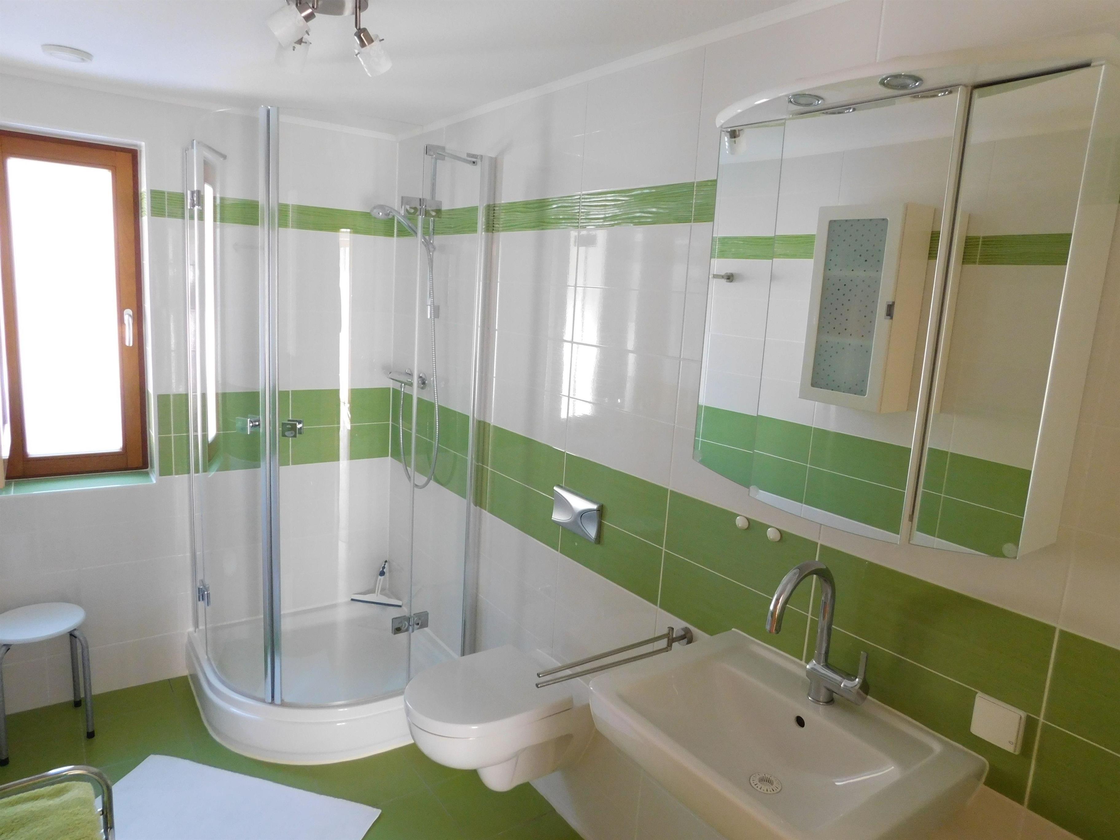 Das helle, moderne Ambiente im Badezimmer 6m² wird Ihnen bestimmt gefallen. Das Bad hat ein separates Fenster und höher hängendes WC und Waschbecken. Es bietet einen gut beleuchtenden 3tlg. Spiegelschrank, einen Badhocker, einen Fön, einen Kosmetikspiegel, einen Hängeschrank und ein Rollelement. Mehrere Handtücher sind einmalig pro Person inklusive.