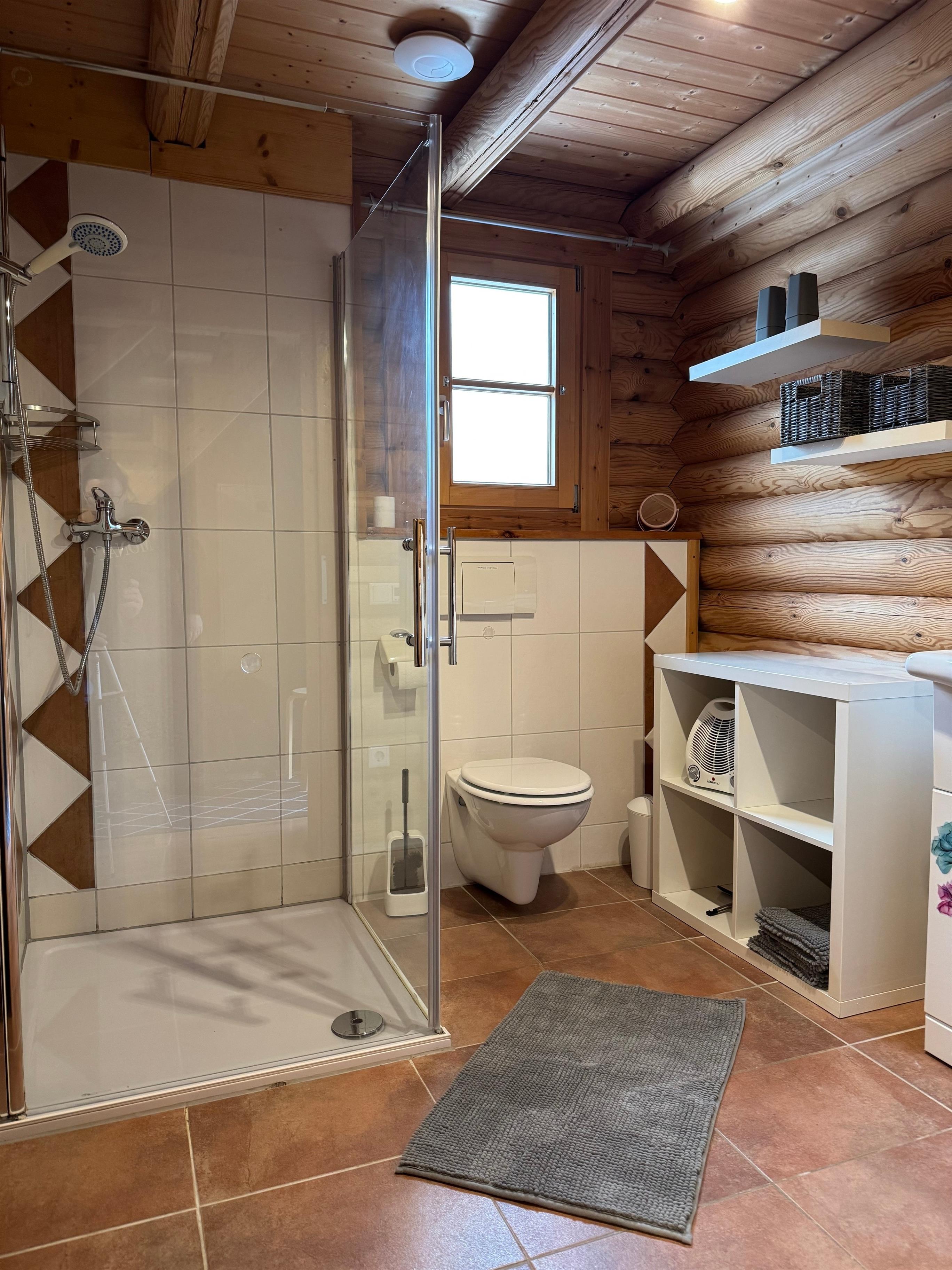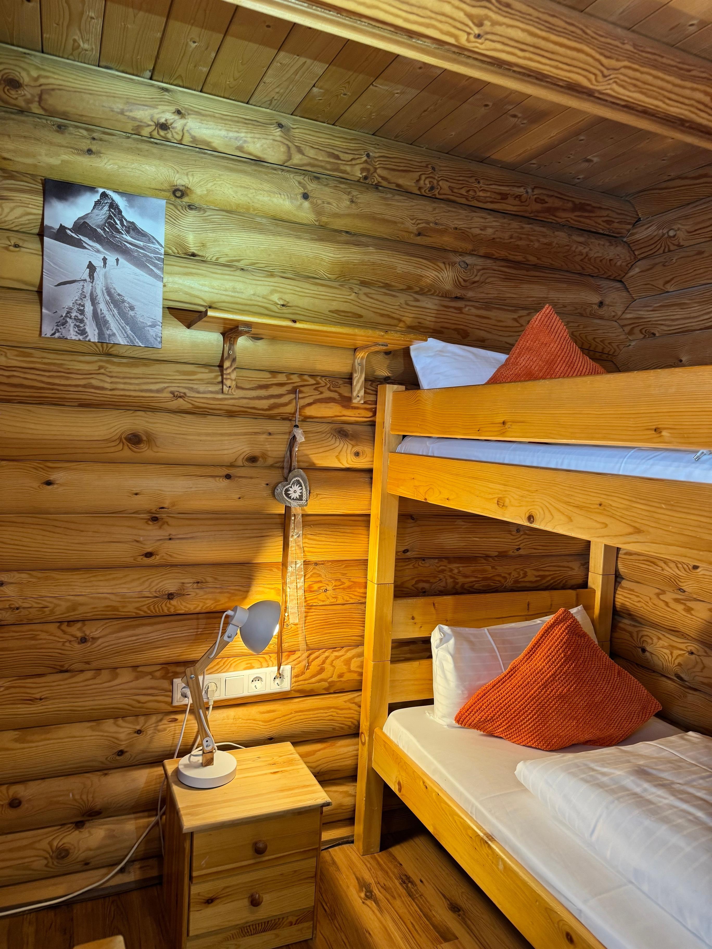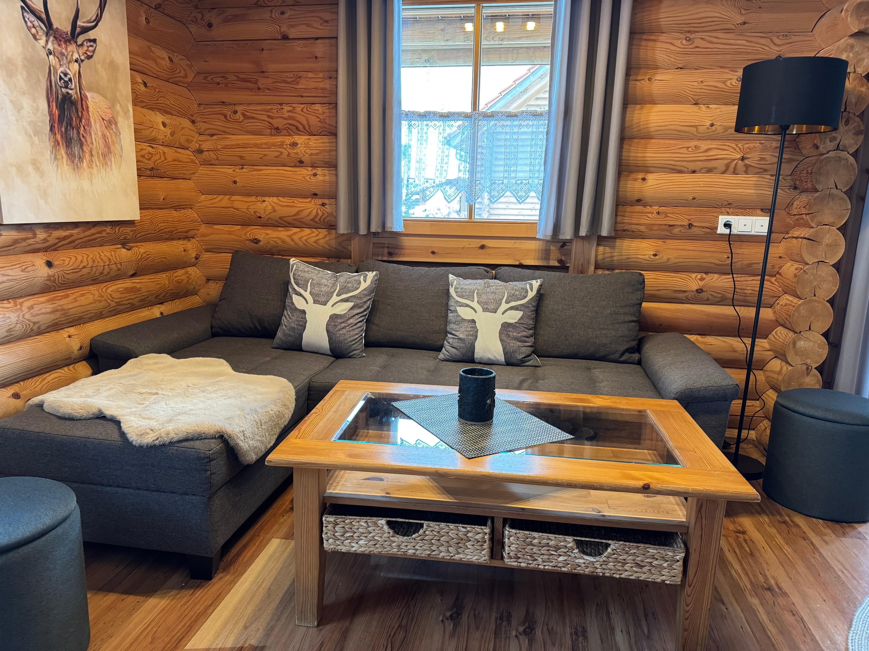Unser Blockhaus bietet Platz für bis zu sieben Personen. Im Obergeschoss befinden sich zwei gemütliche Schlafzimmer mit Doppelbetten, während das Kinderzimmer im Erdgeschoss mit einem Einzelbett und einem Stockbett ausgestattet ist. Die Küche lädt mit ihrer vollständigen Ausstattung – inklusive moderner Geräte – zum gemeinsamen Kochen ein, und der Essbereich ist ideal für gesellige Abende. Für zusätzlichen Komfort stehen Ihnen eine Waschmaschine, ein Bügelbrett und ein Bügeleisen zur Verfügung.