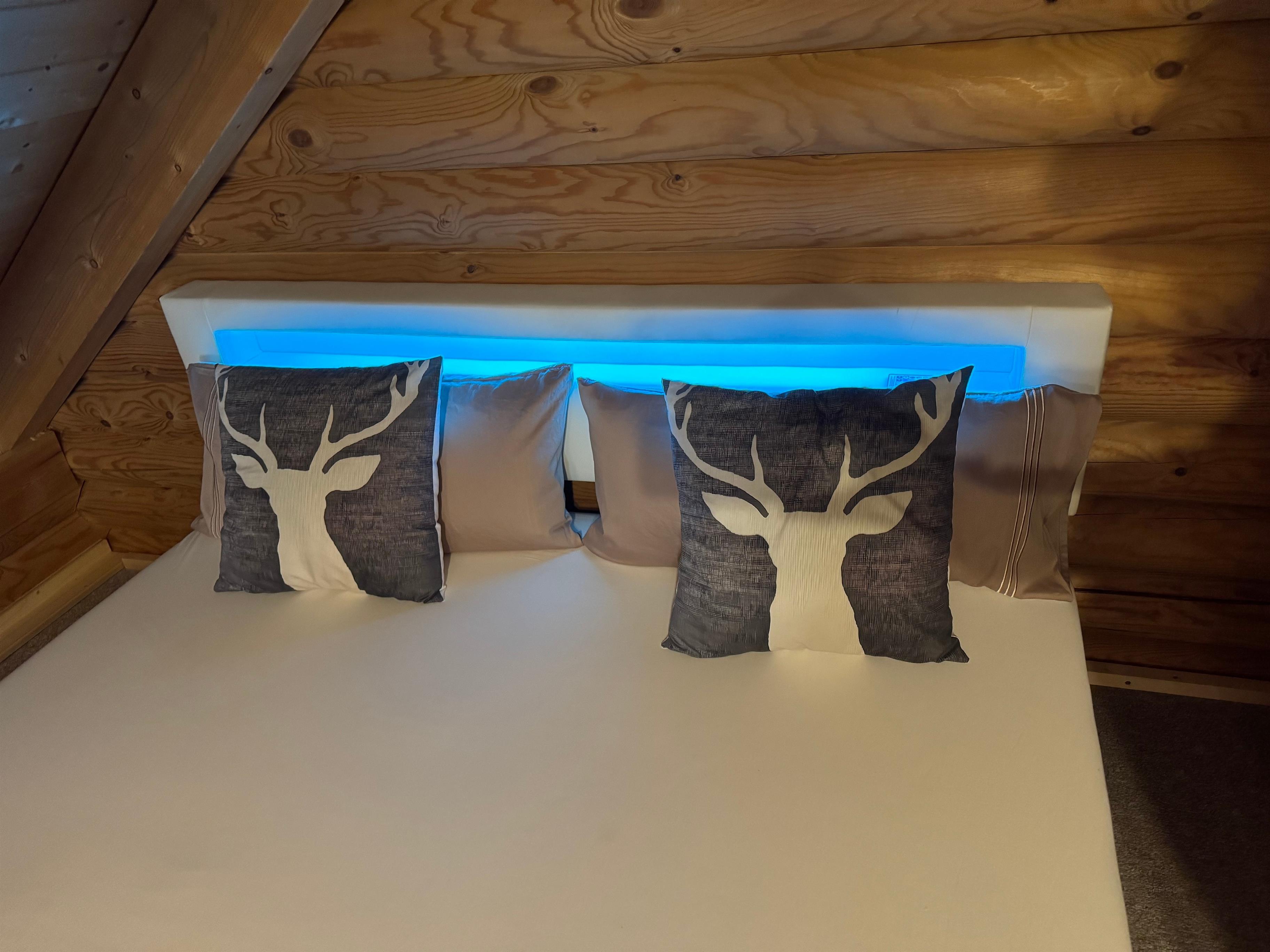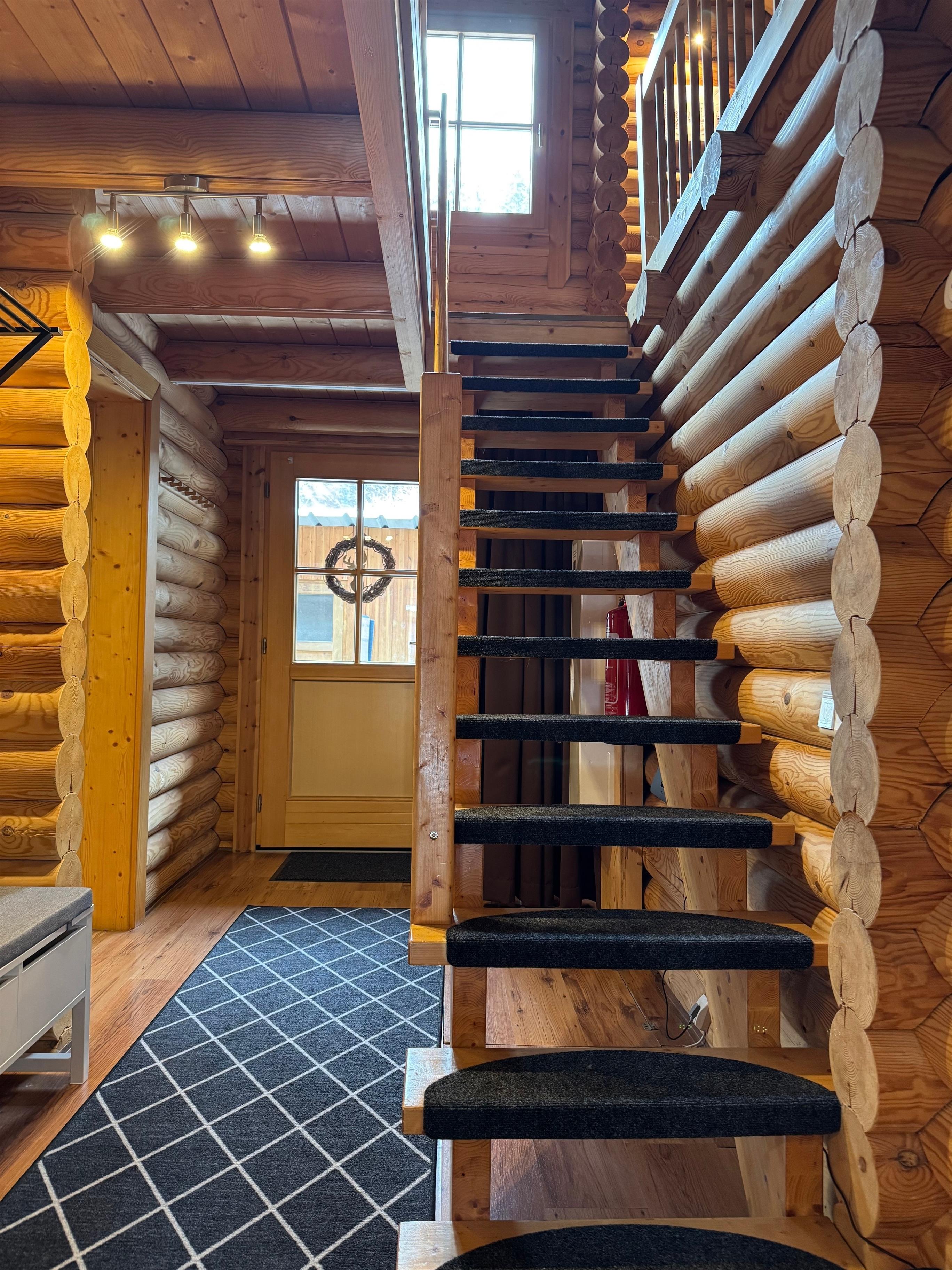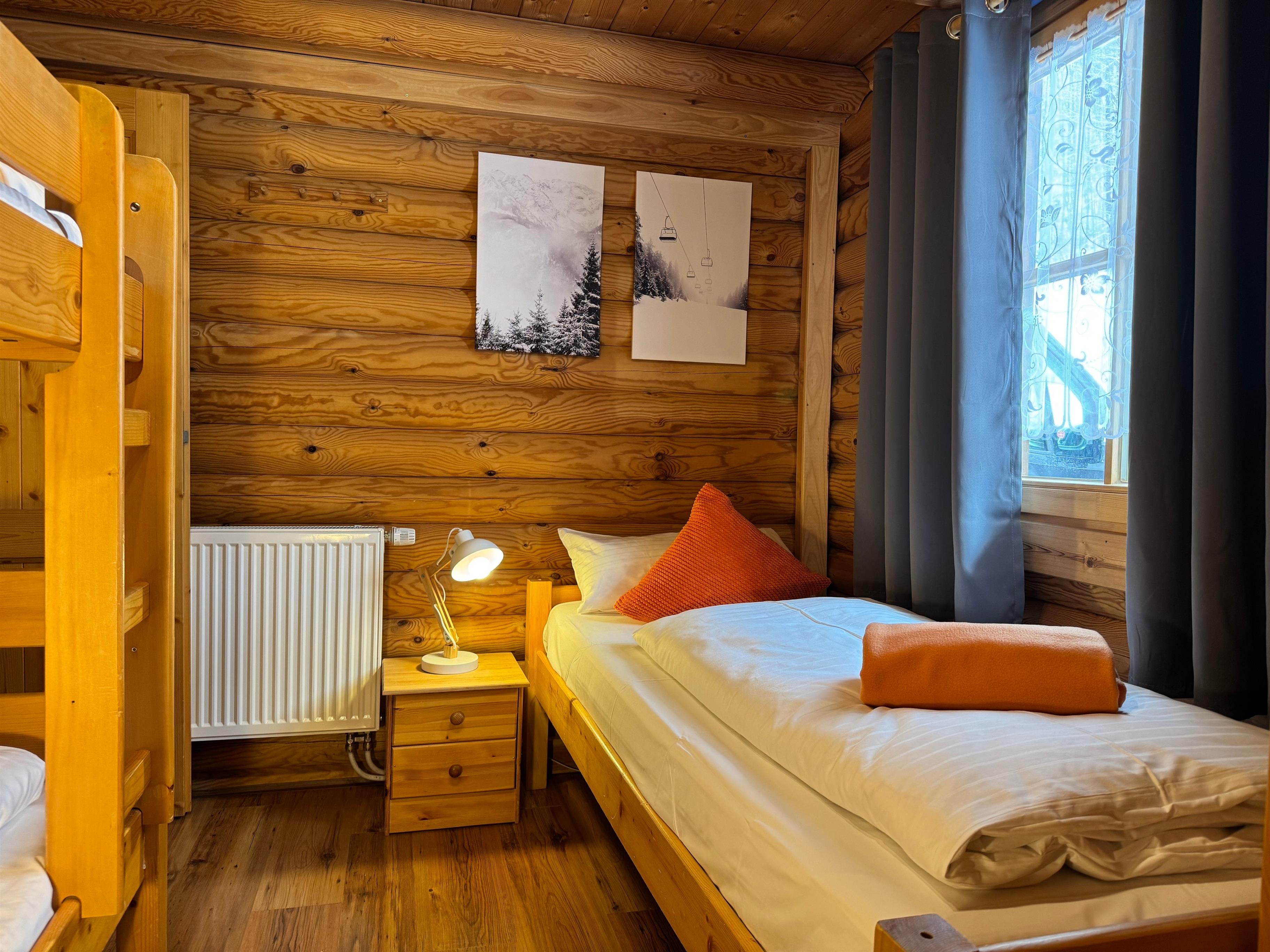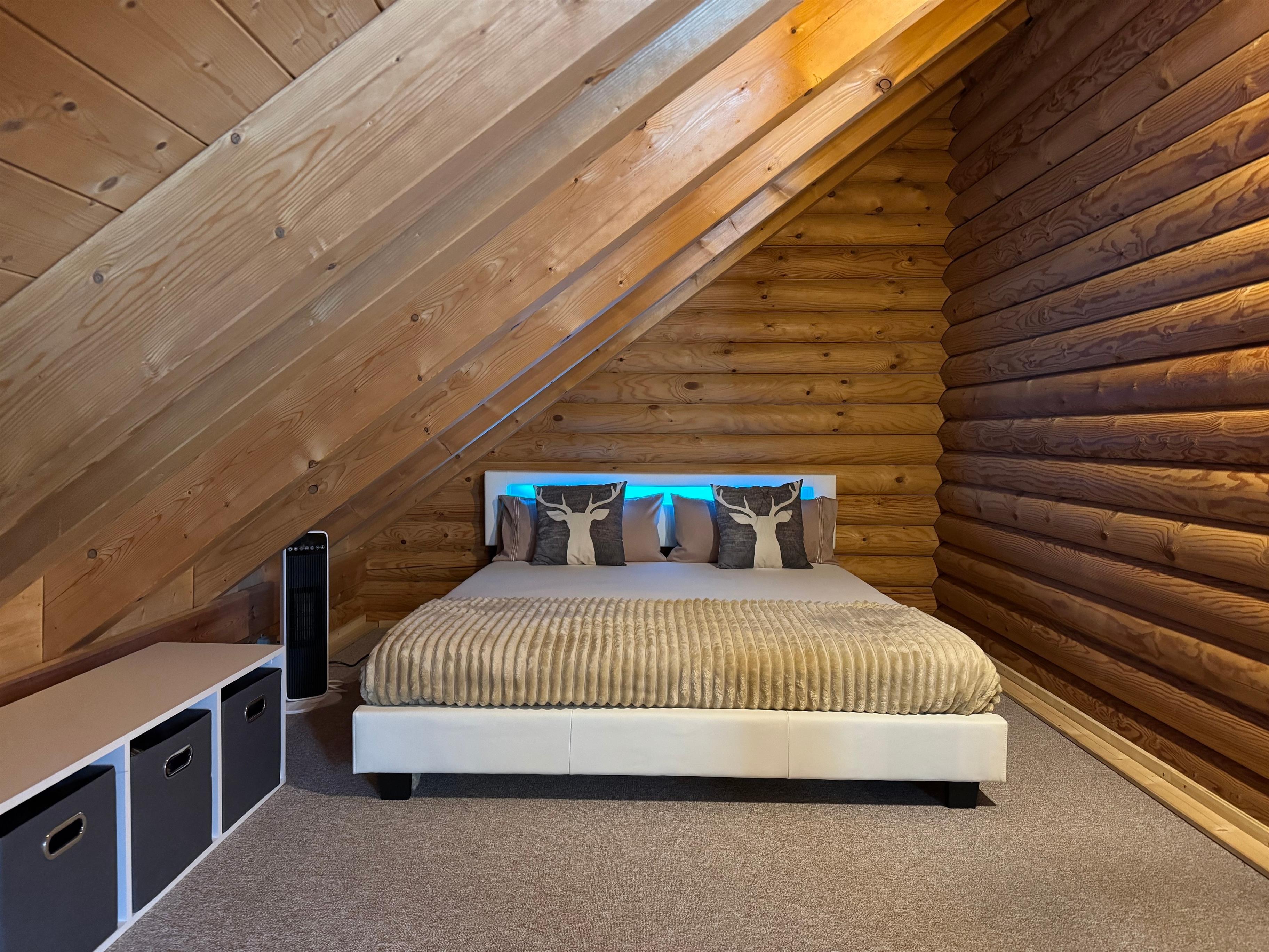 Unser Blockhaus bietet Platz für bis zu sieben Personen. Im Obergeschoss befinden sich zwei gemütliche Schlafzimmer mit Doppelbetten, während das Kinderzimmer im Erdgeschoss mit einem Einzelbett und einem Stockbett ausgestattet ist. Die Küche lädt mit ihrer vollständigen Ausstattung – inklusive moderner Geräte – zum gemeinsamen Kochen ein, und der Essbereich ist ideal für gesellige Abende. Für zusätzlichen Komfort stehen Ihnen eine Waschmaschine, ein Bügelbrett und ein Bügeleisen zur Verfügung.