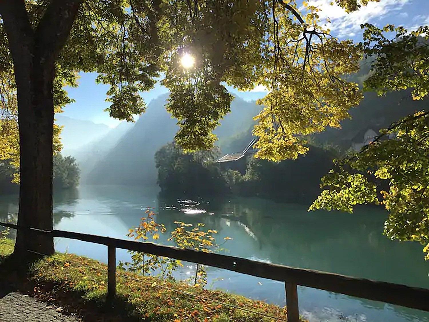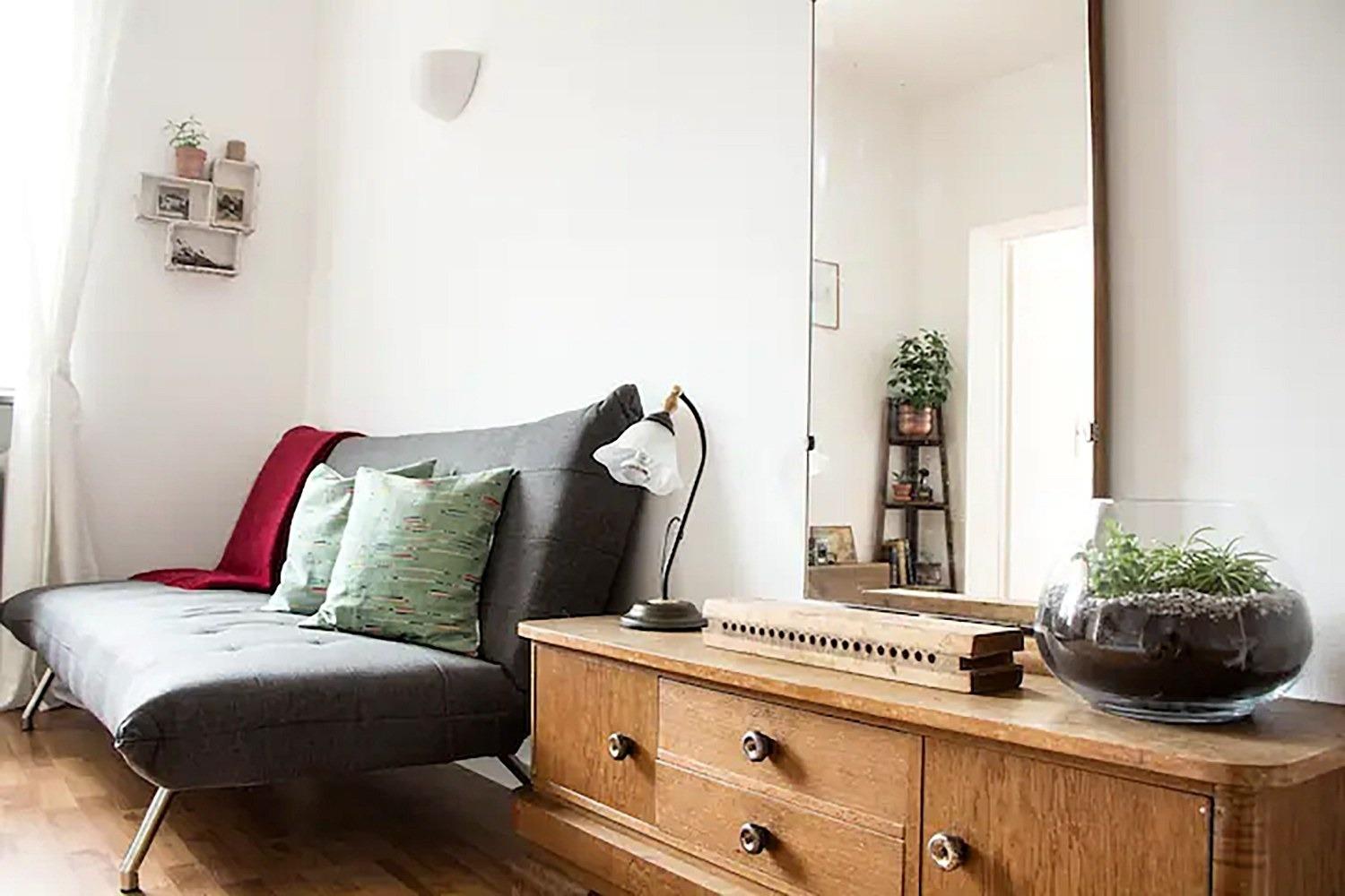 Der offene Wohnbereich verfügt über ein Sofa, eine charmante Sammlung antiker Möbel und Vintage-Kuriositäten sowie viele Grünpflanzen, die dem Raum ein frisches und beruhigendes Ambiente verleihen. Das große Fenster blickt auf den Balkon, den atemberaubenden Fluss Lech und die beeindruckende Bergwelt dahinter.