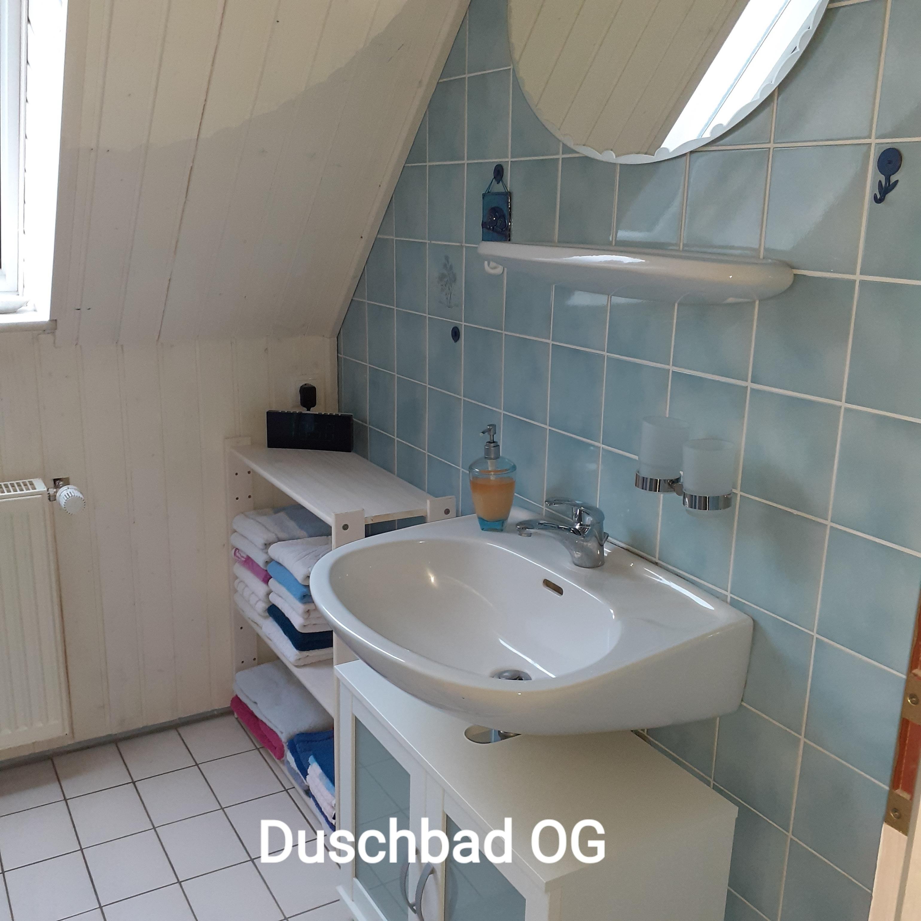 Das Bad verfügt über Handwaschbecken, Dusche und WC. Steckdosen und Ablagemöglichkeiten sind reichlich vorhanden. Ein Abstellraum für Koffer, Schuhe usw. steht zur Verfügung. Hier befinden sich auch Staubsauger, Bügeleisen mit Bügelbrett, Wäscheständer und einige Reinigungsutensilien. Diverse Behälter für Mülltrennung sind vorhanden.