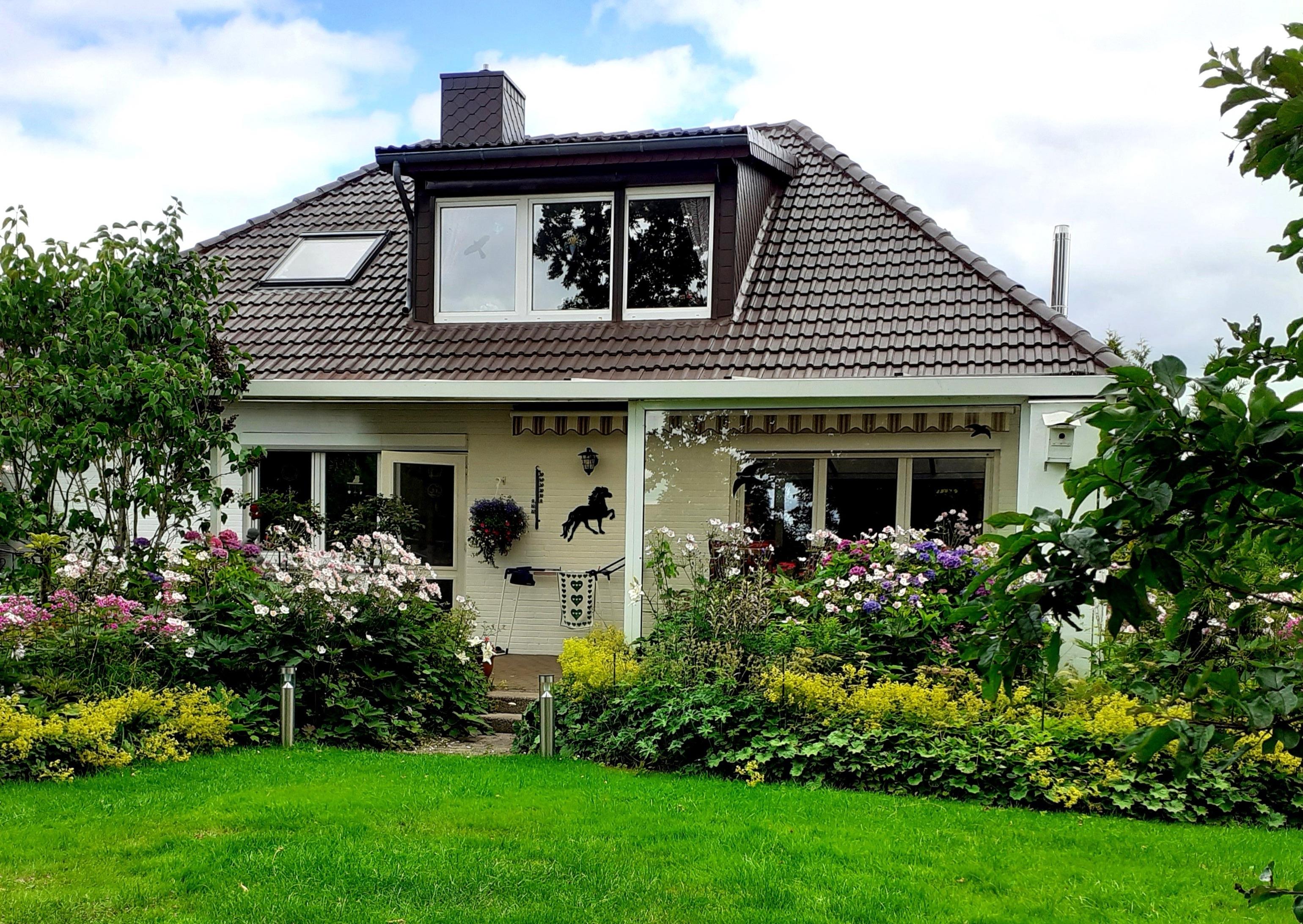 Ruhiges Einfamilienhaus in Fahrdorf mit Garten, Teich und Blockhütte. Die Ferienwohnung liegt im Obergeschoss. Einen Autoabstellplatz bietet der hauseigene Parkplatz. Unterstellmöglichkeit für mitgebrachte Fahrräder ist ebenfalls vorhanden. Hauseigene Fahrräder stehen kostenlos zur Verfügung.