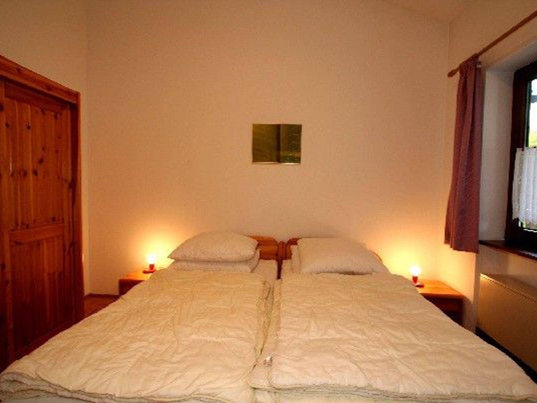 Obergeschoss. Ein Schlafraum mit Doppelbett, ein Schlafzimmer mit zwei getrennten Betten und
