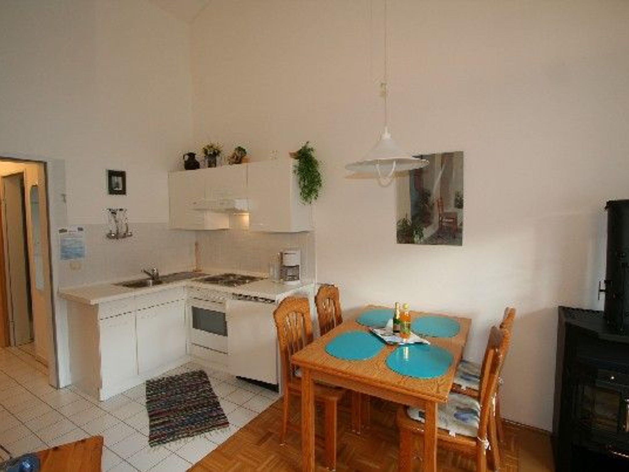 Schlafgalerie für zwei Personen. Wohnraum mit Sitzgarnitur, separater Essplatz, Kaminofen, voll ausgestattete