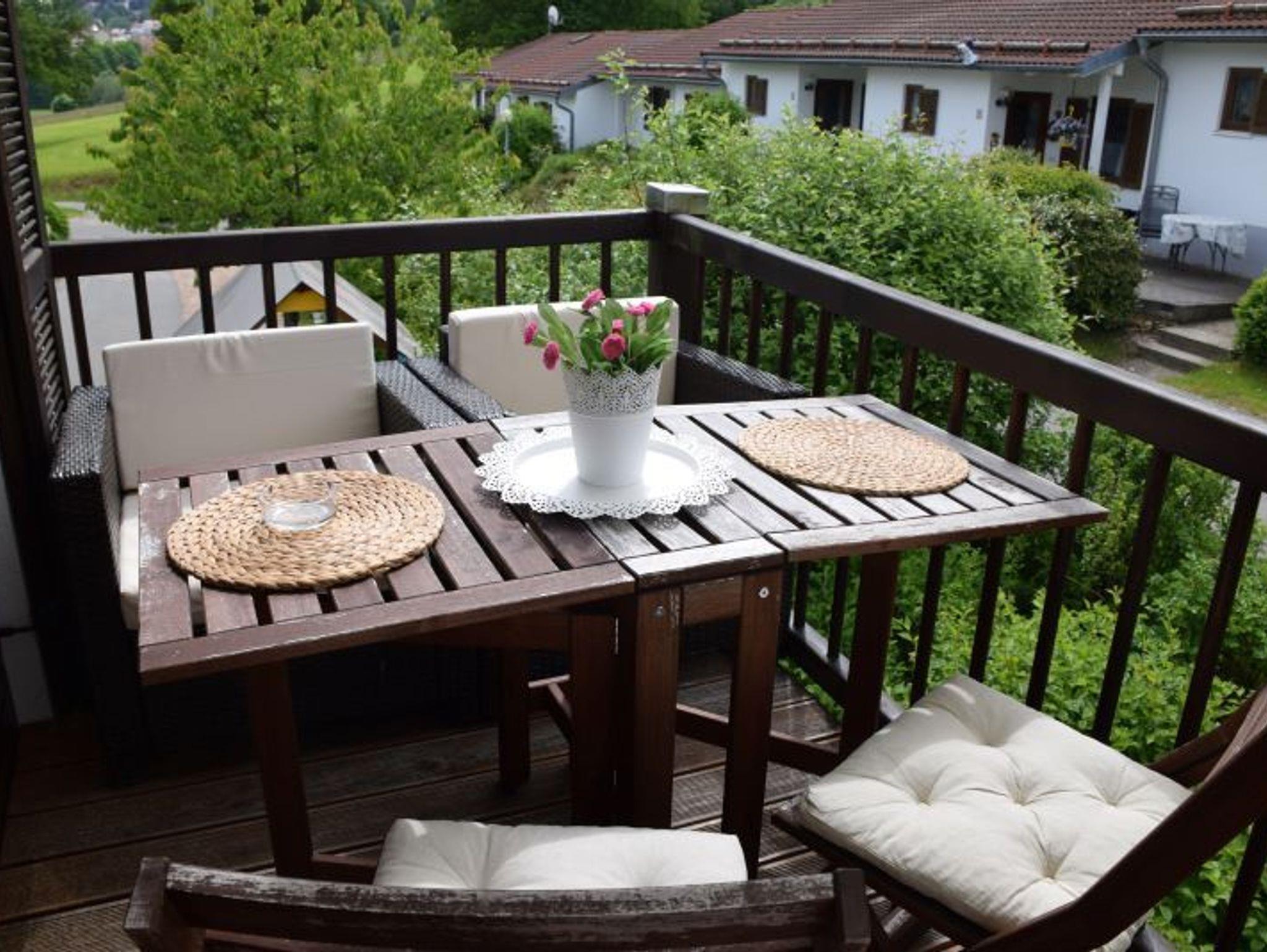 Der nach Osten ausgerichtete Balkon lädt Sie zum Entspannen ein. Auf bequemen Gartenmöbeln können Sie den Blick auf die Burg genießen.