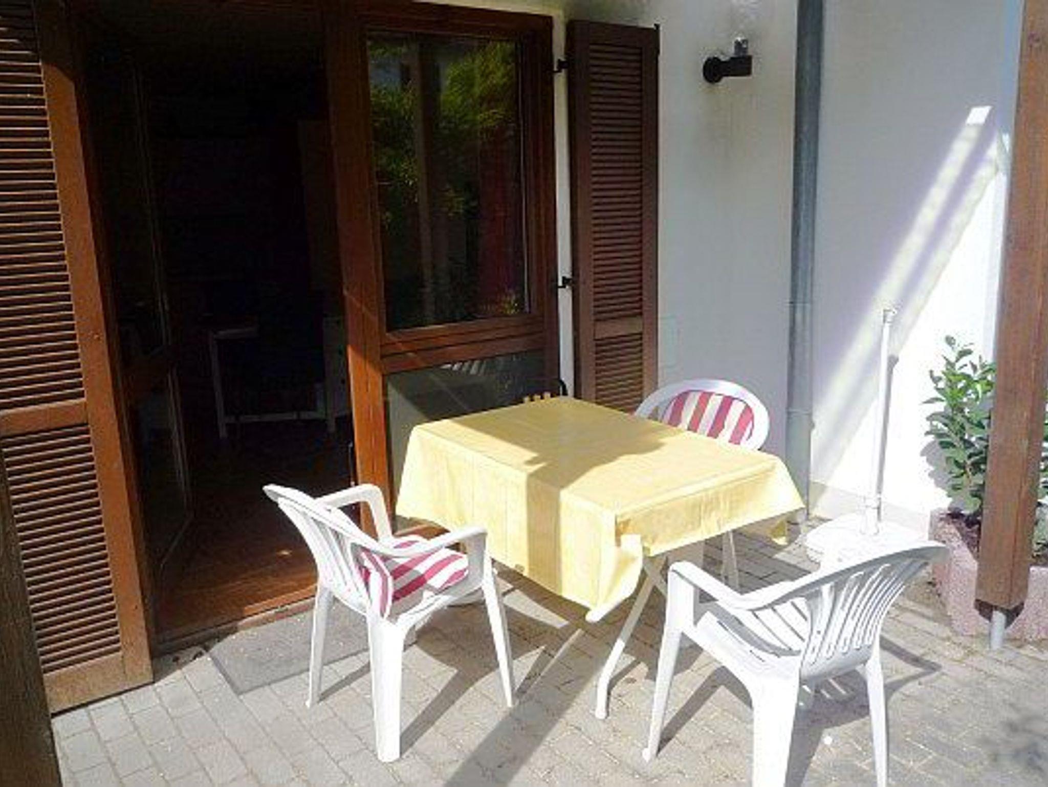 Ein Schlafzimmer mit Doppelbett, Etagenbett in Koje, Kaminofen, separater Essplatz, voll ausgestatteter Küchenbereich mit Spülmaschine, Kühlschrank mit Gefrierfach, Mikrowelle. Relaxsessel und ausklappbares Bettsofa im Wohnzimmer. Diele mit Garderobe, Dusche/WC, Terrasse, LCD-TV und Telefon, Internet. Kinderhochstuhl, Kindergeschirr, Kinderterrassenmöbel, Liege.