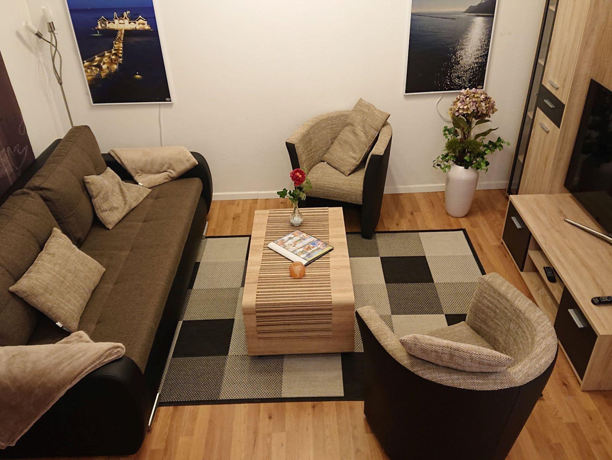 2-Zimmer-Ferienhaus für bis zu 4 Personen (in Ausnahmen auch für 6 Personen - nach Rücksprache), ca. 44 m², ein Schlafzimmer mit Doppelbett und Schlafgalerie, Wohn-/Schlafraum mit einem bequemen Schlafsofa, mit Kaminofen, separater Essplatz, voll ausgestatteter Küchenbereich, Diele mit Garderobe, Bad mit RegenDusche & WC, Terrasse, 50 SAT-Farb-TV und Telefon.