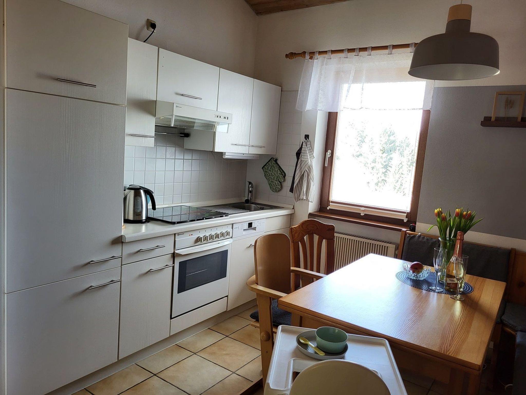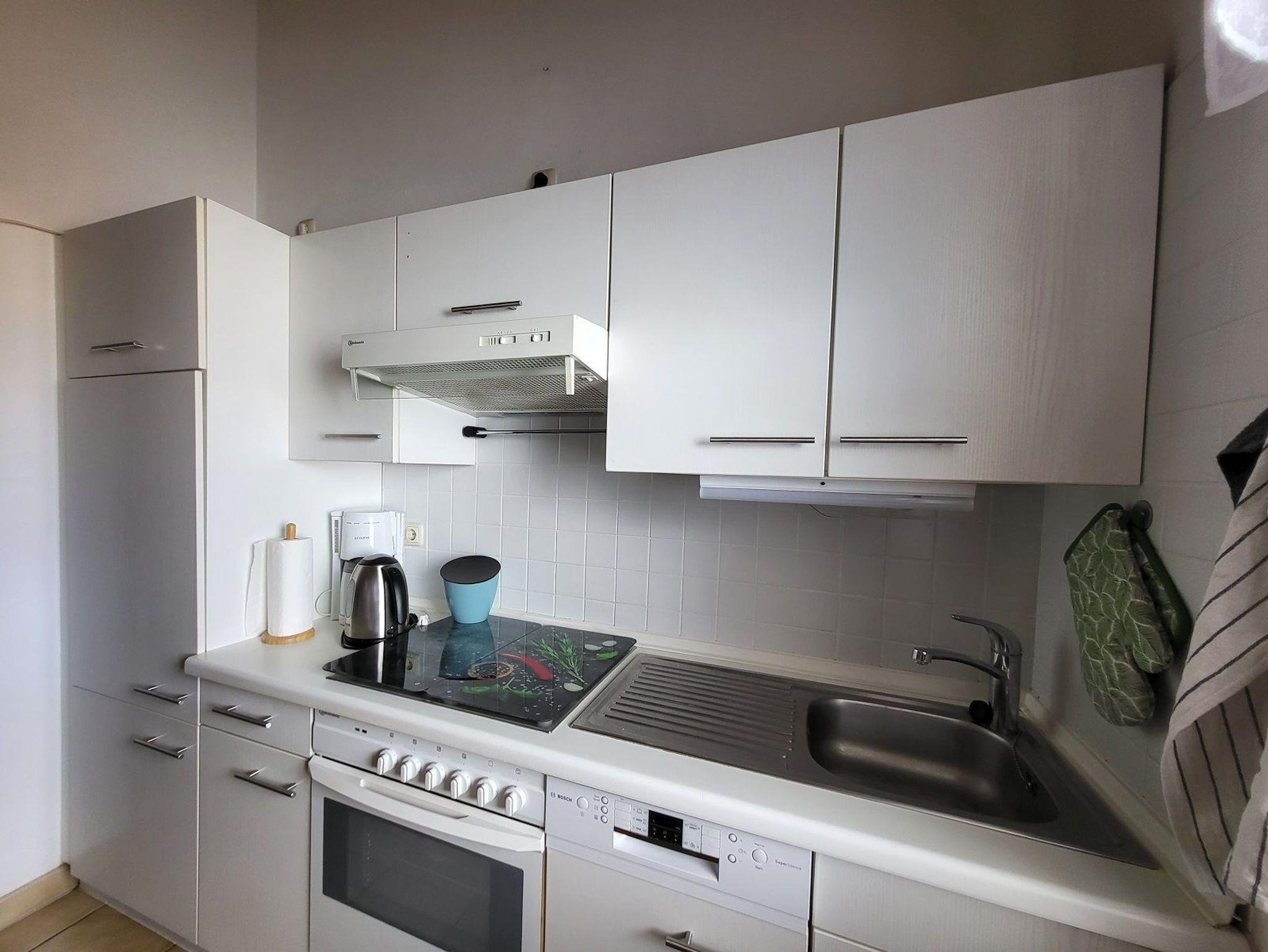 Die voll ausgestattete Küche (Herd mit Backofen, Kühlschrank, Spülmaschine, Mikrowelle, Kaffeemaschine, Wasserkocher, Toaster) lässt ebenfalls keine Wünsche offen. Eine äußerst bequeme Essecke, mit Eckbank und ausziehbarem Tisch runden den Raum ab.
