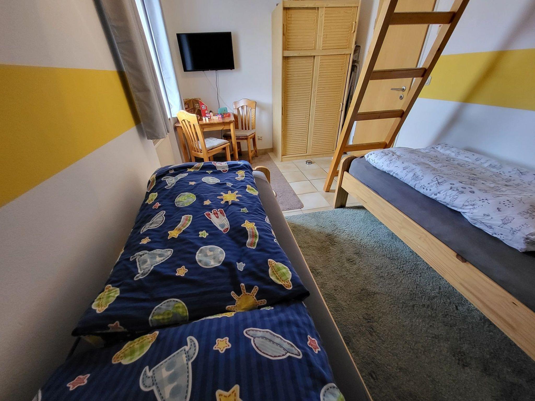 Das Kinderzimmer/2. Schlafzimmer verfügt über ein Etagenbett und zwei Einzelbetten und bietet somit für bis zu 4 Personen genügend Schlafraum. Hier haben wir einen zweiten Flachbildfernseher installiert.