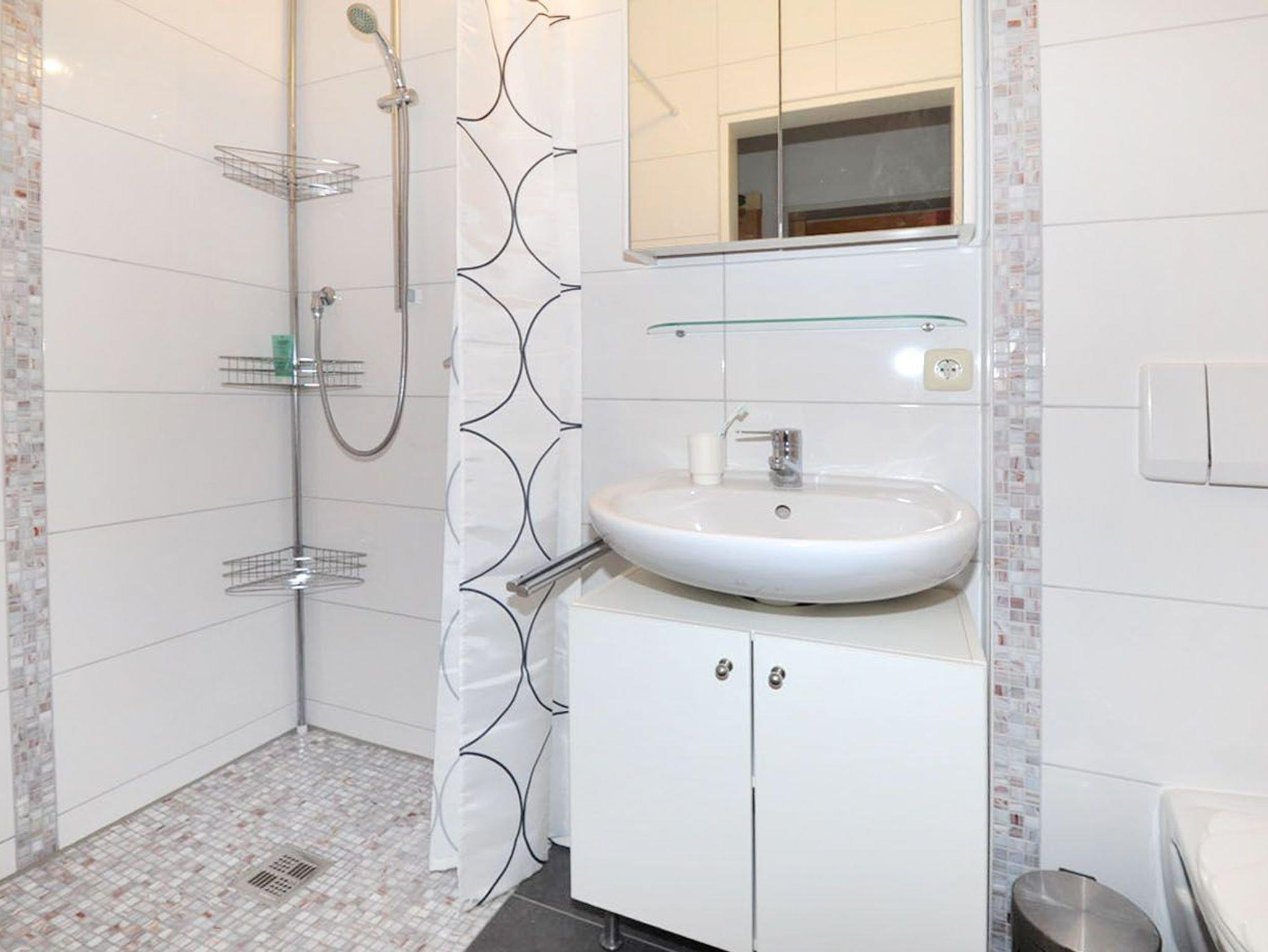 Das geflieste Bad mit ebenerdiger Dusche, mit Föhn und Hocker / WC.