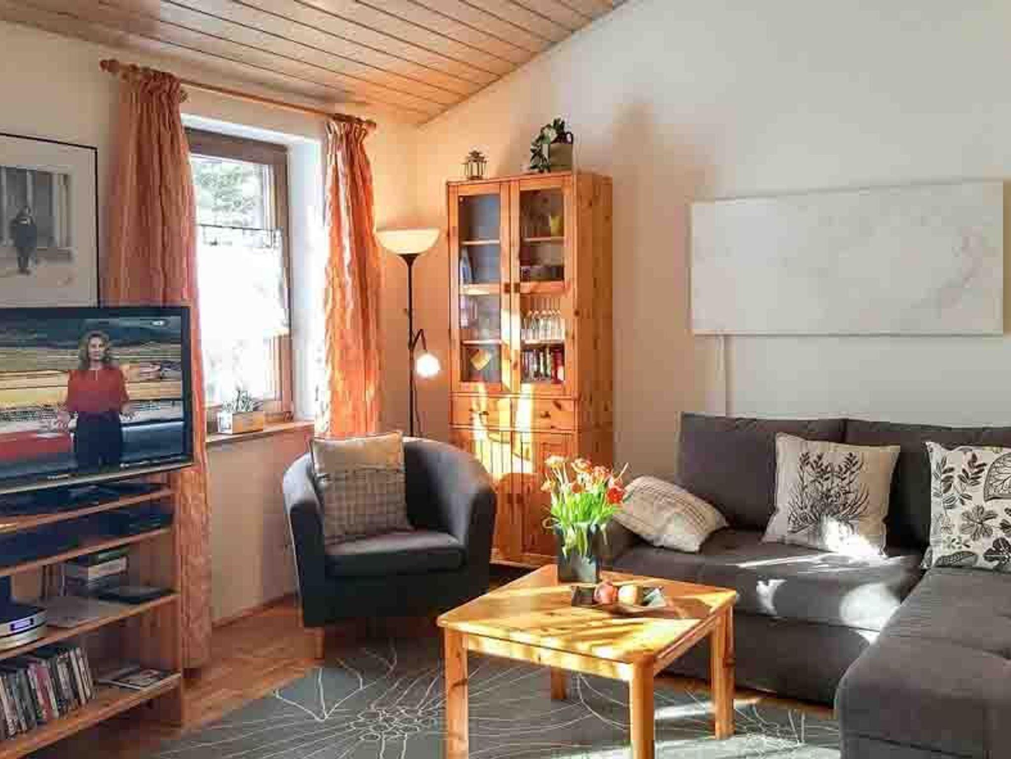 Der Wohn-/Schlafraum mit moderner und sehr bequemer Doppelbettcouch und einem Kaminofen, Stereoanlage mit CD/Mp3 Player und Blu-ray Player, kostenloses WLAN, SAT-TV, sky und Telefon, im Schrank finden sie Bücher und Spiele.