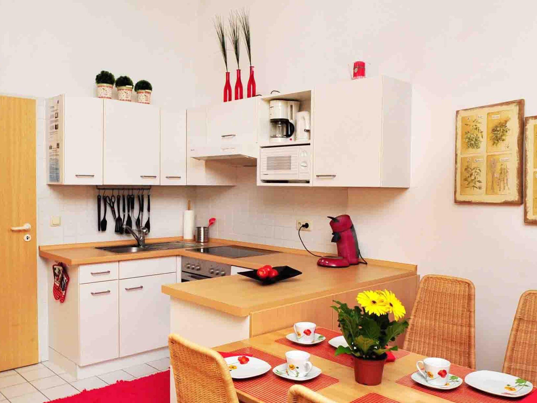 Ein separater Essplatz mit voll ausgestattetem Küchenbereich mit Geschirrspüler, Mikrowelle, Senseo Kaffemaschine, zusätzlicher standard Kaffeemaschine, Eierkocher, Toaster und Rührgerät mit Mixer.