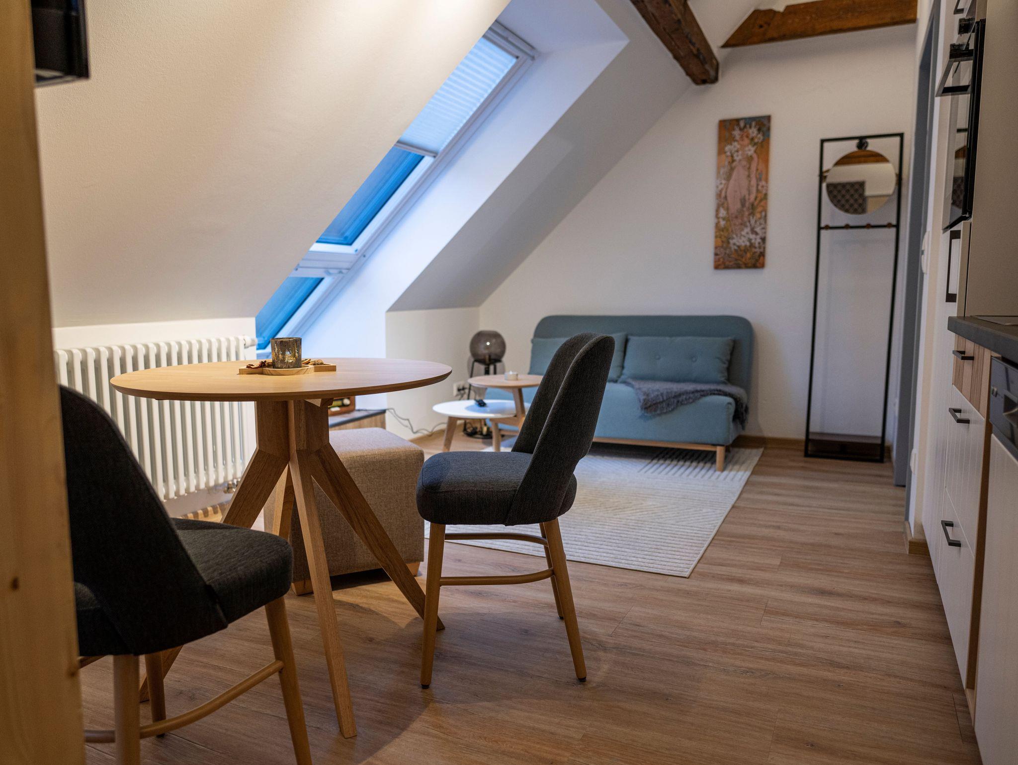 Hell und freundlich gestaltete Dachwohnung für 2 bis 3 Personen. Die Wohnung verfügt über einen großzügigen Wohn-/Schlafraum mit bequemem Sofa, Doppelbett sowie eine offene, gut ausgestattete Küche und ein Bad.