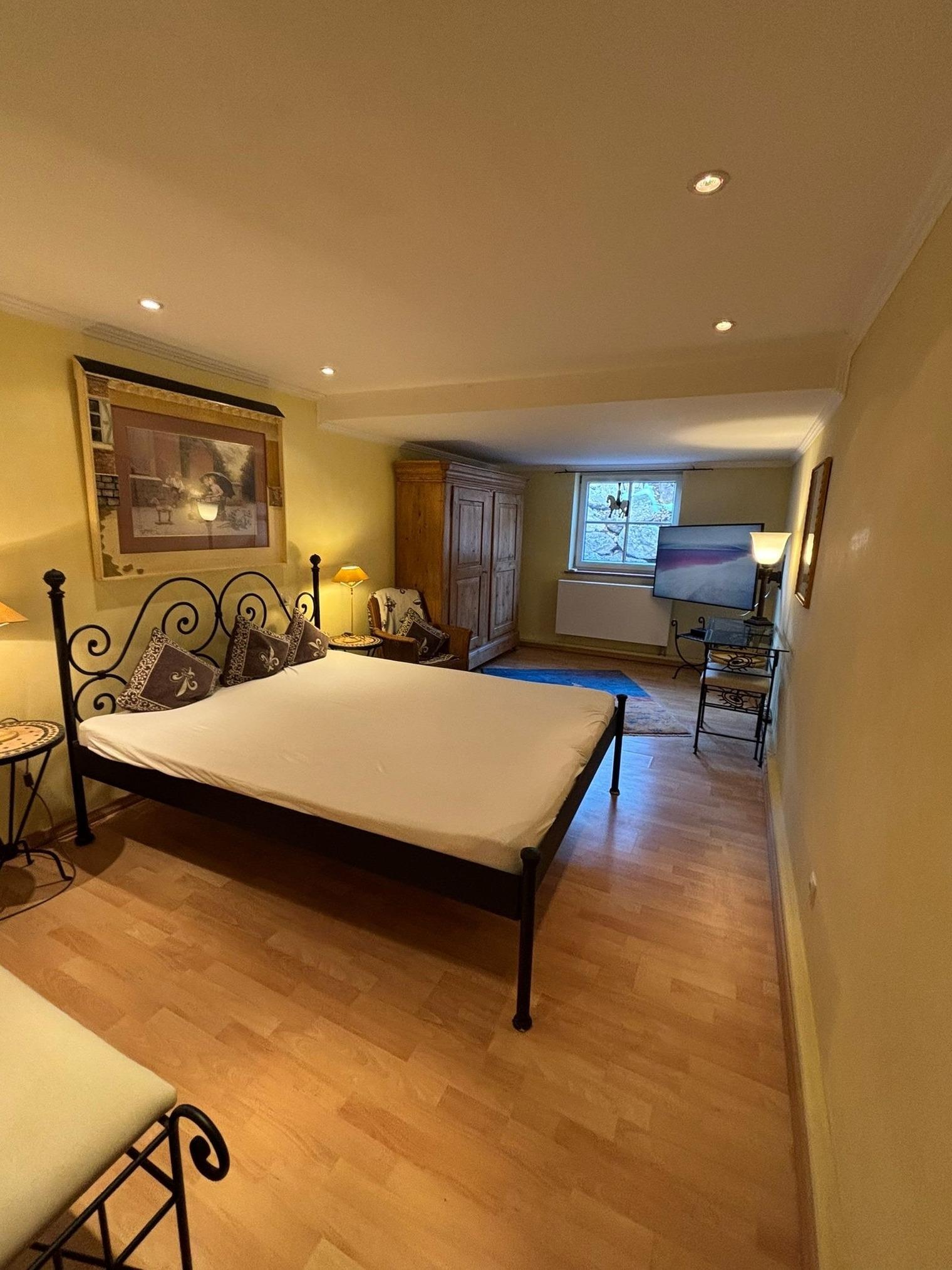 Im Souterrain befindet sich ein ruhiges, modernes Schlafzimmer mit eigenem Bad und großem Flachbild-TV – ideal als privater Rückzugsort nach einem aktiven Tag in den Bergen.