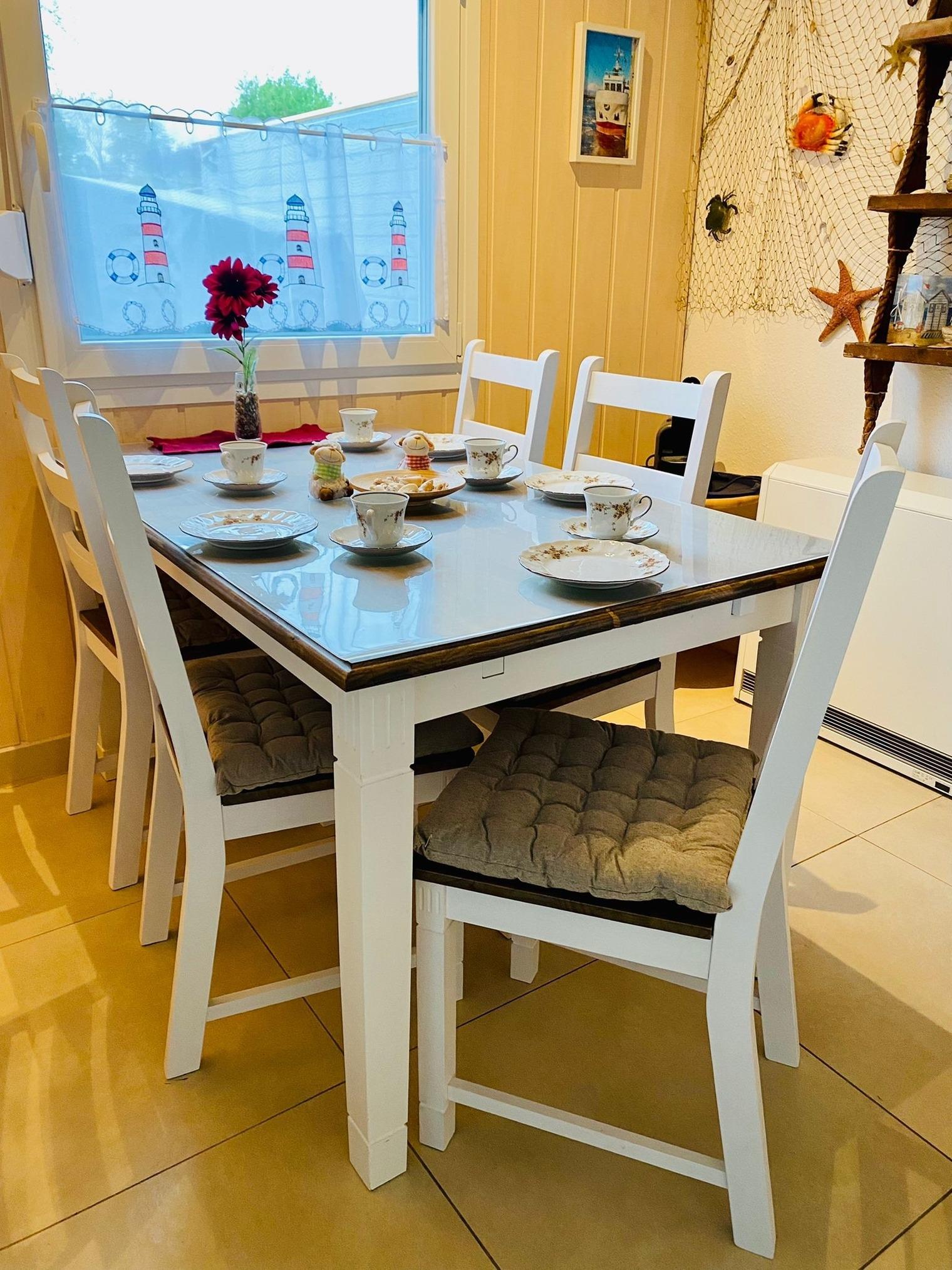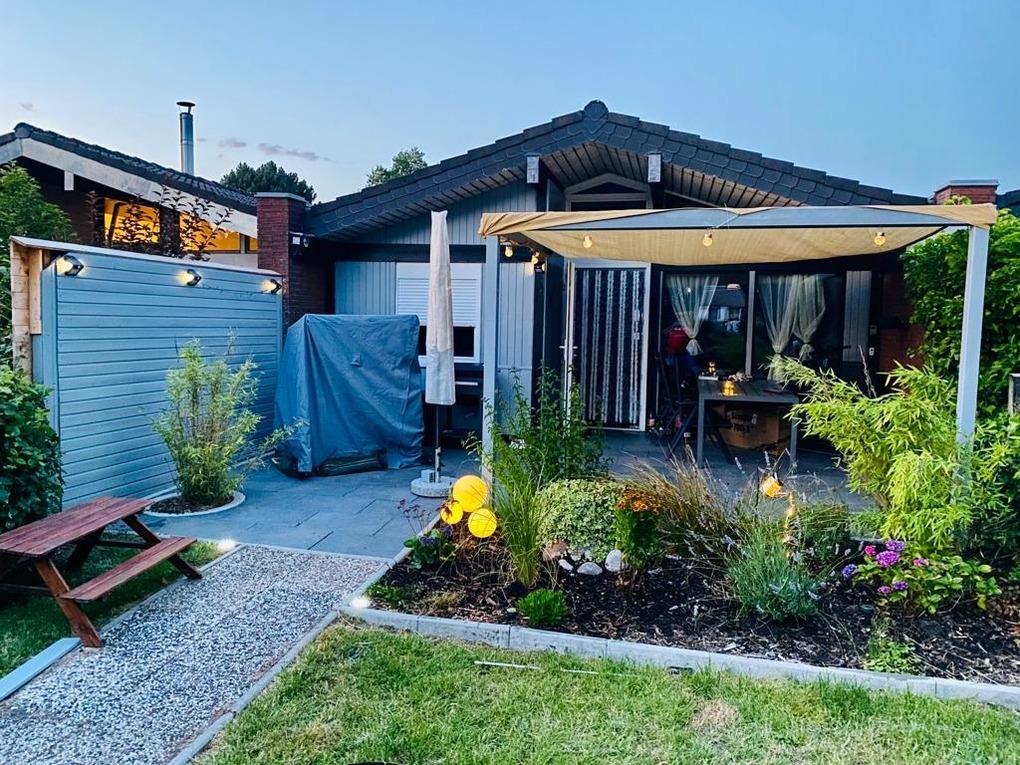 Sie finden im Wohnzimmer eine gemütliche und moderne Einrichtung mit Radio und Flachbildschirm, davor eine bequeme Couchgarnitur. Die angrenzende Küche ist vielseitig ausgestattet. Die Küche hat eine Essecke mit Sitzbank und Stühlen, die Küchenzeile ist ausgestattet mit einem Kühlschrank, Geschirrspüler, Mikrowelle, Kaffeemaschine und Wasserkocher sowie ausreichendem Küchenzubehör und einem 4 Plattenherd mit Backofen. Das Elternschlafzimmer ist mit einem Ehebett und einem großzügigen Kleiderschrank ausgestattet, das Kinderzimmer hat ein freistehendes Bett sowie ein Etagenbett und einen Kleiderschrank. Das Badezimmer ist mit einer Duschwanne und einem elektrischen Dachfenster ausgestattet, im angrenzenden Wirtschaftsraum finden Sie eine Waschmaschine. Die Terrasse und der komplett eingezäunte Garten lädt zum Verweilen ein und bietet den Kindern eine Menge Möglichkeiten zum Spielen und auch Ihr Hund wird sich in diesem Garten wohlfühlen. In unserer Blockhütte stehen für Sie zur kostenfreien Mitbenutzung der Grill sowie der Bollerwagen bereit. Nutzen Sie diesen gerne als Transportmittel für den ca. 1 Kilometer entfernten Strand mit reserviertem Strandkorb in Burhave (saisonabhängig). Das kostenfreie W-Lan sowie ein Parkplatz in unmittelbarer Nähe runden die Möglichkeiten zusätzlich ab. Die Energie- und Endreinigungskosten sind im Preis enthalten. Das Mitbringen von Haustieren (maximal 2) ist gegen Gebühr gestattet. Bettwäsche und Handtücher können gegen Gebühr entliehen werden.