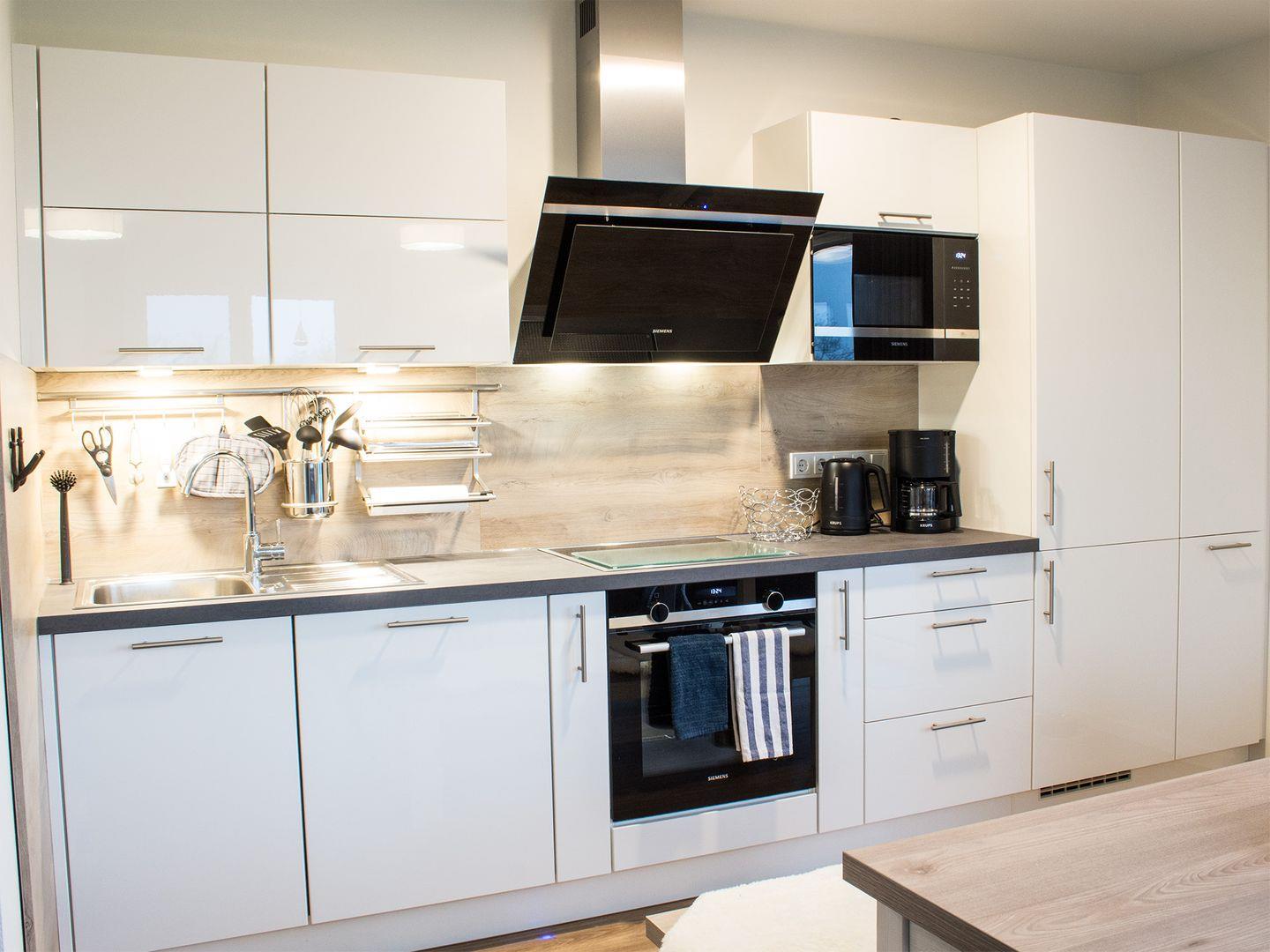 Der großzügige Wohnbereich mit komfortabler Sofaecke, drei Sesseln und Gaskamin lädt zu gemütlichen Stunden ein – ob bei einem spannenden Film oder beim Lesen im flackernden Licht des Feuers. Eine moderne Fußbodenheizung sorgt auch an kühleren Tagen für eine angenehme Atmosphäre. Der Smart-TV mit Blu-Ray-Player, CD-Anlage sowie Bücher, Spiele und DVDs bieten Unterhaltung für Groß und Klein. Die offene Küche ist hochwertig ausgestattet und lässt keine Wünsche offen – perfekt für gemeinsame Kochabende und lange Mahlzeiten am großen Esstisch.
