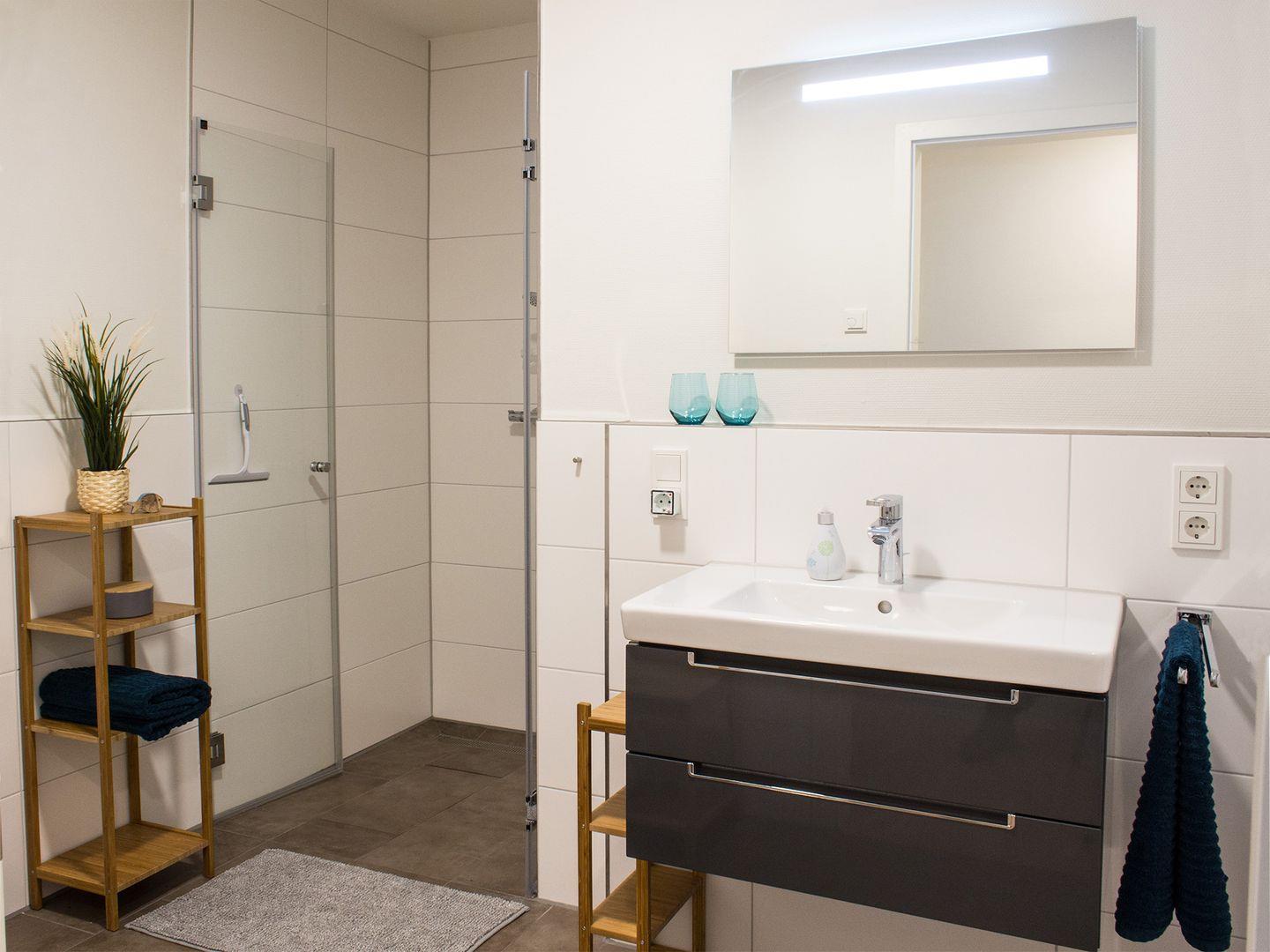 Die Ferienwohnung verfügt über zwei stilvolle Badezimmer – beide mit ebenerdiger Dusche, großem LED-Spiegel, Schminkspiegel und Föhn. Im Tageslichtbad lädt deine private Sauna zum Entspannen ein. So kannst du deinen Tag mit wohltuender Wärme und Ruhe abschließen.